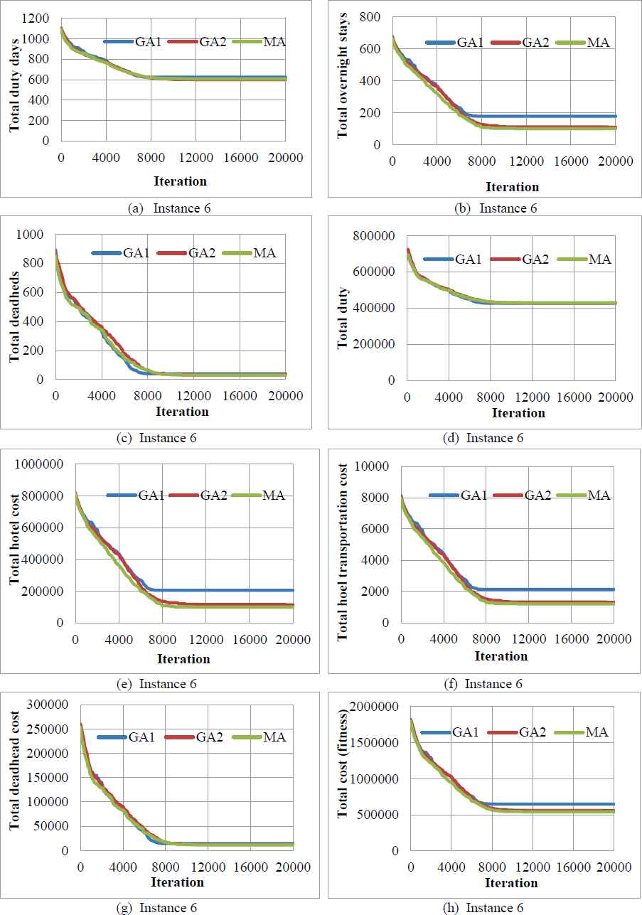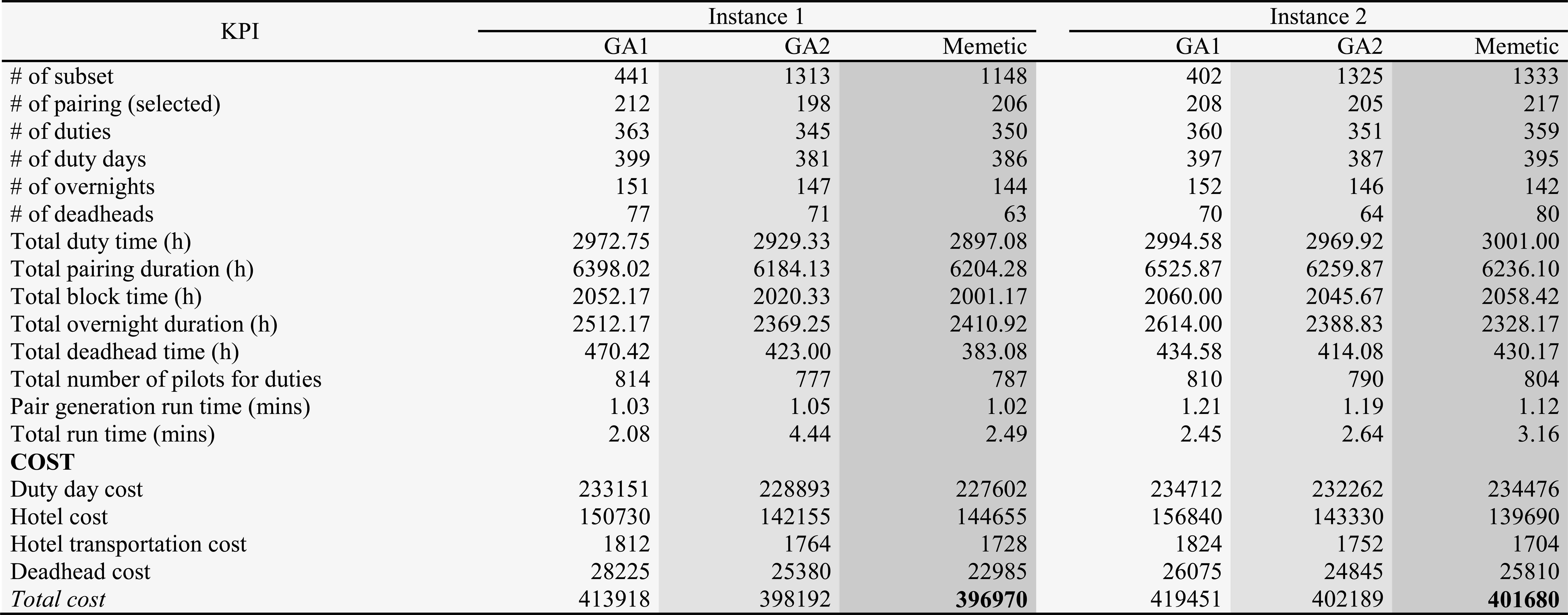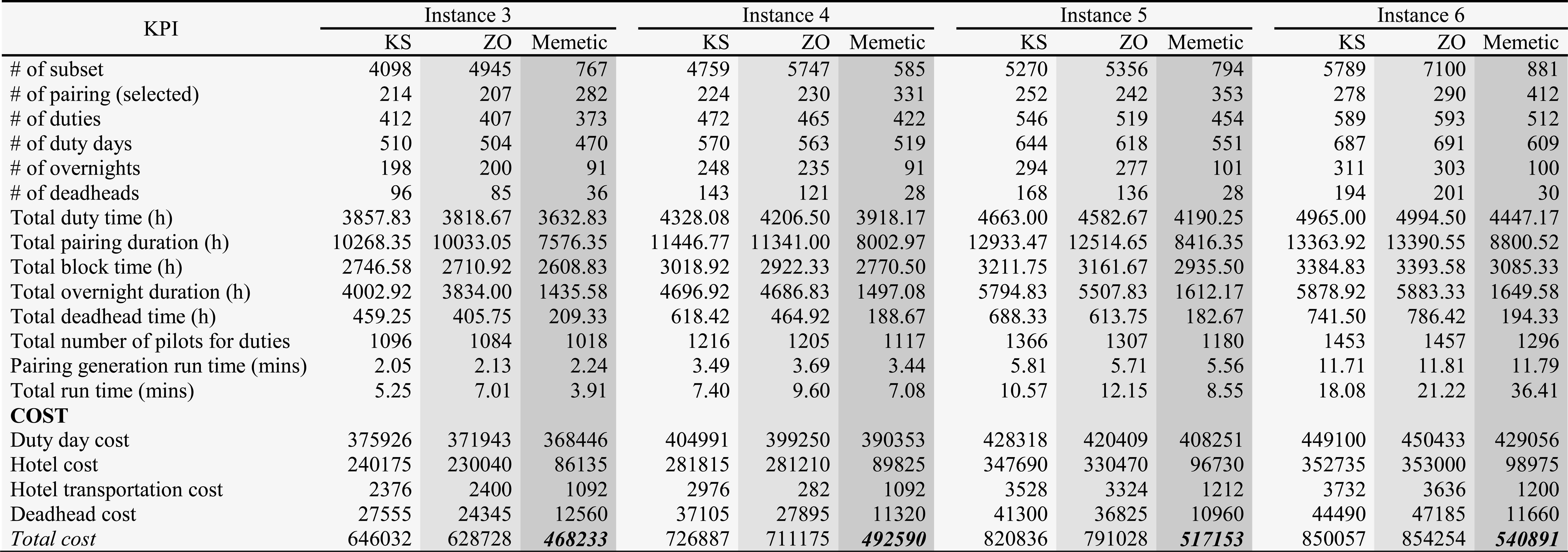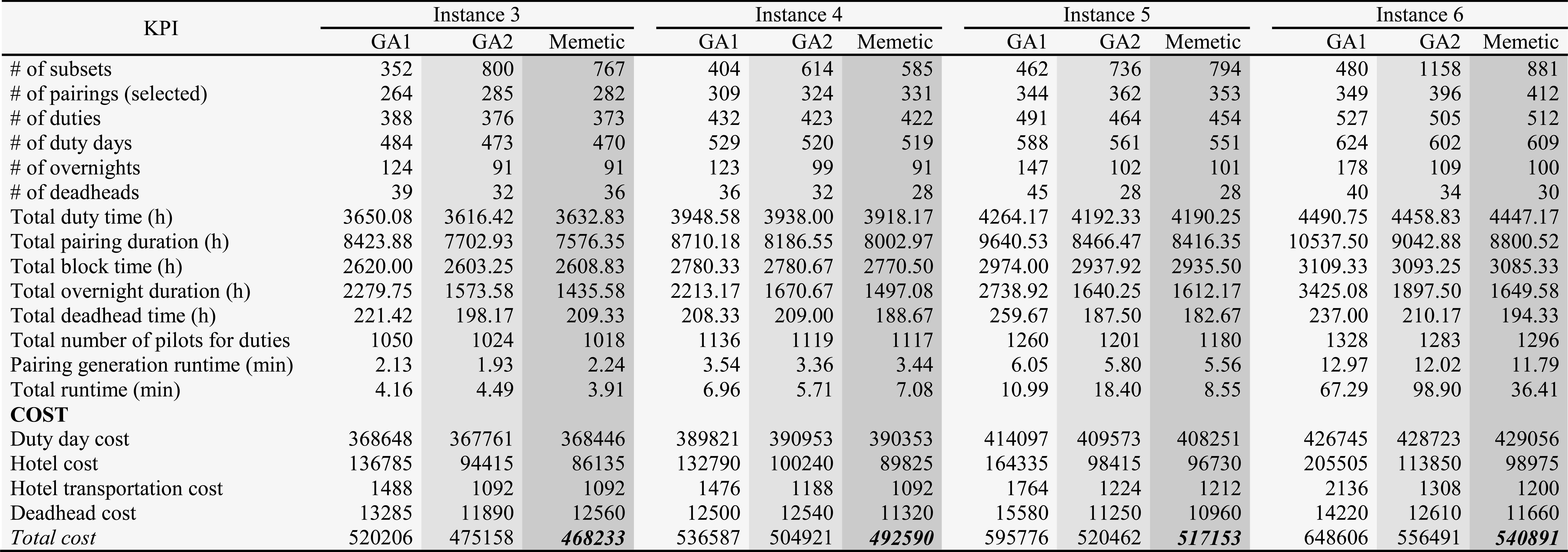 Novel dynamic-based GA variations and a MA approach are proposed to obtain a crew pairing solution set with the minimum cost. In Fig. 6, graphics are shown for the following KPIs (e.g., instance 6) obtained via the optimization of the proposed approaches: number of deadheads: total number of deadheads; deadhead time: total flight times of deadheads; duty days: total number of duty days; overnight stays: total number of overnight stays; overnight duration: total time of overnight stays; and fitness: total crew pairing cost.