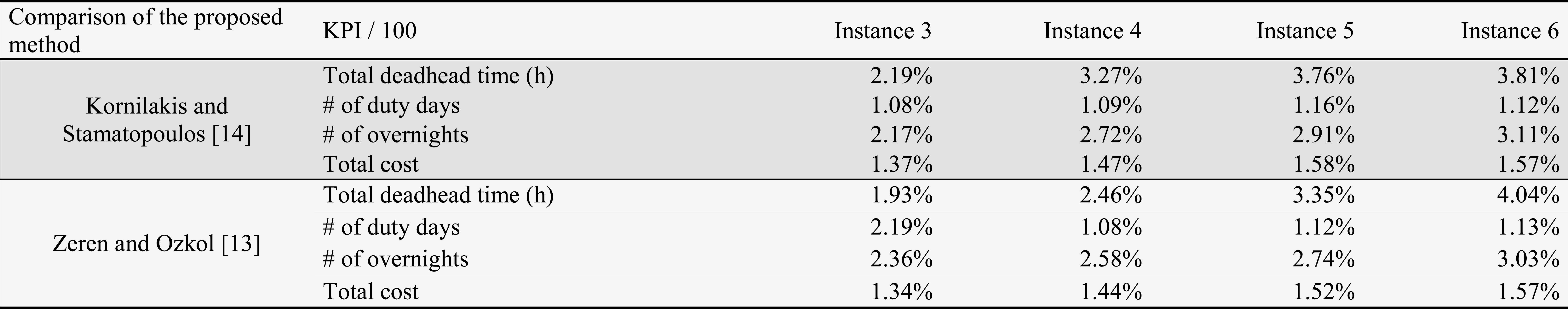 Three important parameters are presented in Tables 8 and 9: total man-days, deadheads, and layovers/overnights. The solutions are generally evaluated via these three parameters. Evaluating other parameters is meaningful if these three values are close to each other. Because financial costs are not determined, the total cost can provide insights for planning, although the solutions are always evaluated with the three important parameters because of operational difficulties. According to the planning period, the overnight, deadhead and man-day parameters are prioritized based on their level of importance.
