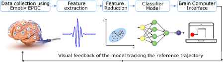 In this study, feature extraction, feature reduction and classification approaches have been applied to raw EEG data respectively. Later, generated model was tested using simulations and RT experiments. No prior study has been carried out combining aforementioned methods to make a RT trajectory tracking application. The aforementioned steps are designed considering the given flow chart given in figure 1.