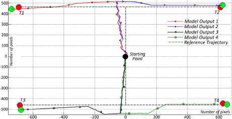 Following the simulation process, the reference trajectories are set as given in figure 3 and 4 to test RT tracking performance. Since repeated switching in a short period of time is distracting, the switching between 4 tasks after 30 seconds, so that the user could concentrate on a specific task and maintain the stability of the active task, was tried. The dual task combination is given in figure 3. Here, the user initiated the test from a starting point to reach 4 different targets. The reference trajectories are plotted as dashed lines and the system output is plotted as straight colored lines. For each target, the user restarted the process. As each target is accessed, the new trajectory is given to the user. For the first target, T1, the user is supposed to imagine the tasks to move the green ball to T1 by reciting the alphabet backwards and imagining the rotation of a cube. Later, for target T2, the user focused on the tasks reciting the alphabet backwards to move the green ball up and imagining of right hand movements to move the green ball right respectively. In order to move the green ball to target T3, the user focused on performing mathematical operations to move the ball down and imagined rotation of a cube to move the ball left respectively. Finally, the user made mathematical operations to move the ball down and later imagined right hand movement tasks to move the ball right for target T4.