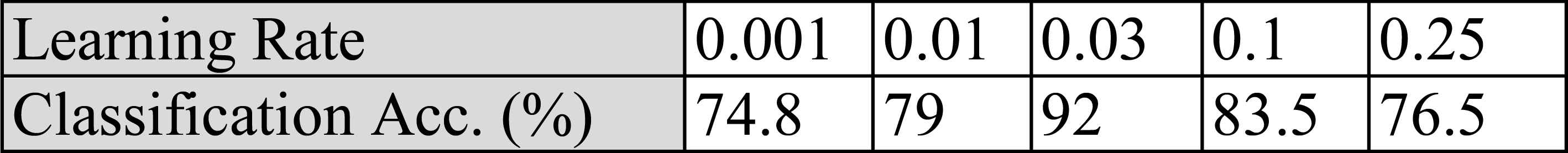 After applying the filtering and WPD, a valuable feature is to be determined. The dimension of the input training matrix and input test matrix for each feature was set as 14x1600 and 14x400 before the training process. MPNN trained by a standard BP algorithm, which uses the gradient steepest descent method to train the parameters of the network, was implemented later for classification. Nevertheless, the error curve may converge very slowly or the solution may fall into local minima at the end of the training process. Since there are 14 electrodes and approximately 18 features from each electrode, 250 neurons were assigned first but observed that the accuracy was better for 190 neurons for the hidden layer. As far as the learning rate is concerned, it is an important factor to control the gradient descent and to find an optimal learning rate. A small learning rate affects the convergence speed and the training may take much longer time than with a higher learning rate. A large learning rate may help the network escape from local minima, but the NN may go through a large oscillations and may never converge [48]. It was also explored that the values from “0.001” to “0.25”, namely “0.001, 0.01, 0.03, 0.1” and “0.25” as the various values of learning rate, and the optimal results were achieved with the learning rate of “0.03”. The results are given in table 1.