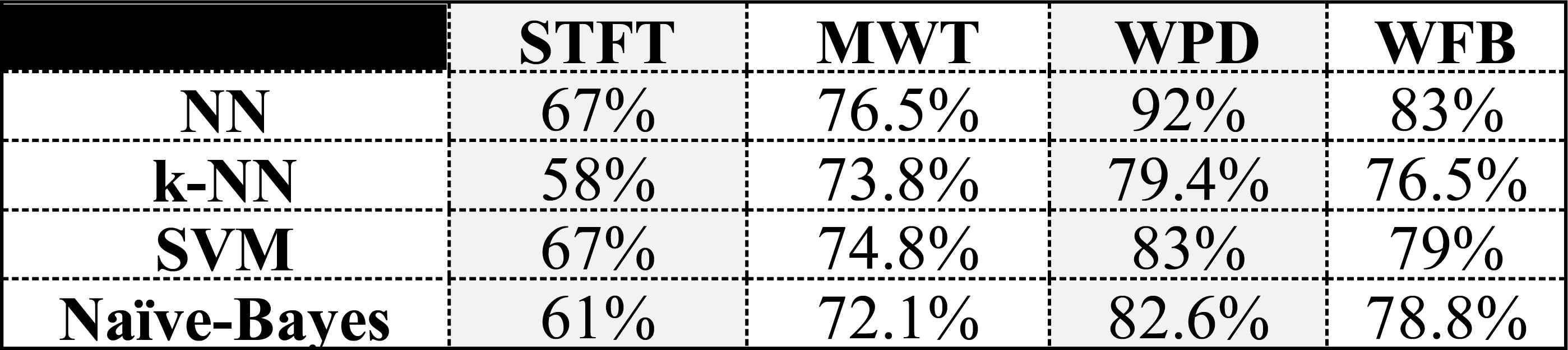 Classification performances of NN, k-NN, SVM, NB
