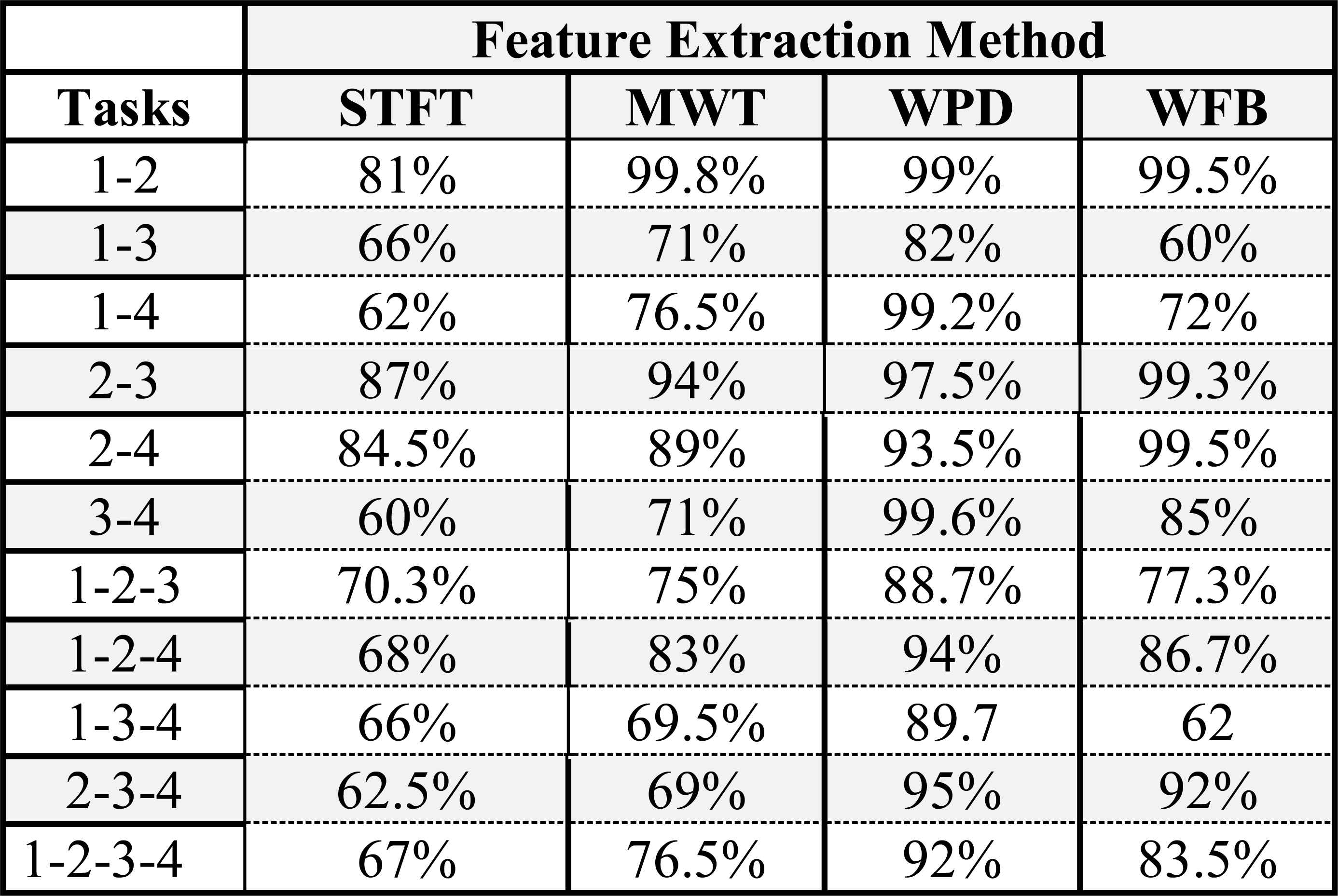 The WPD method is also good for classifying “2-3”, “2-4” numbered tasks. STFT and MWT revealed the worst performance in the classification of “1-3”, “1-4”, “3-4”, “1-2-3”, “1-3-4”, “2-3-4” numbered tasks. Table 4 gives the confusion matrix for four mental tasks using WPD.