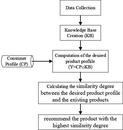 By performing a composition operation between the matrices KB1 and KB2, we obtain the overall knowledge base KB with KB=KB1°KB2. KB is a (N×M)-dimensional matrix, characterizing the relations between N-dimensional consumer profiles and M-dimensional product profiles.