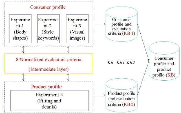 We have four sensory experiments for collecting human perception data. Experiment 1, 2 and 3 aim at finding out the relations between body types, style keywords, visual images and the 8 evaluation criteria. Experiment 4 finds out the relations between the design styles and the same 8 evaluation criteria. The combination of Experiment 1, 2 and 3 permits to generate Knowledge Base 1 while the results of Experiment 4 are used to form Knowledge Base 2. The relation is given below (see Figure 2).