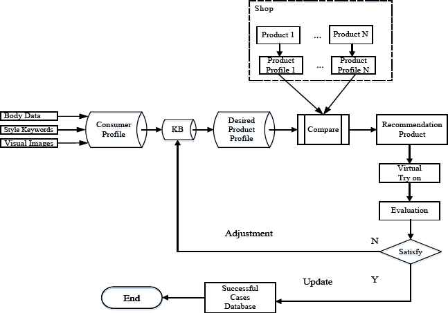 For recommending relevant garments, there are two modules in this system, namely 1) the Knowledge-based Recommendation Module for providing more personalized products; 2) the Knowledge Updating Module, enabling to progressively improve the quality of the knowledge base according to the unsatisfied evaluation descriptors on currently recommended products.