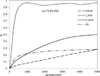 Fig. 3 shows the different success rate for above algorithms with different restrictions of generation and L=75, P=100. Under different restrictions of generation, the success rate of the AGA algorithm is almost 0, so it is not represented in the figure. As can be clearly seen from above Fig. 3, the I_AGA algorithm is better than other algorithms even if the restart strategy is not used. That is to say, the performance of the G_AGA algorithm is obviously superior to other algorithms.