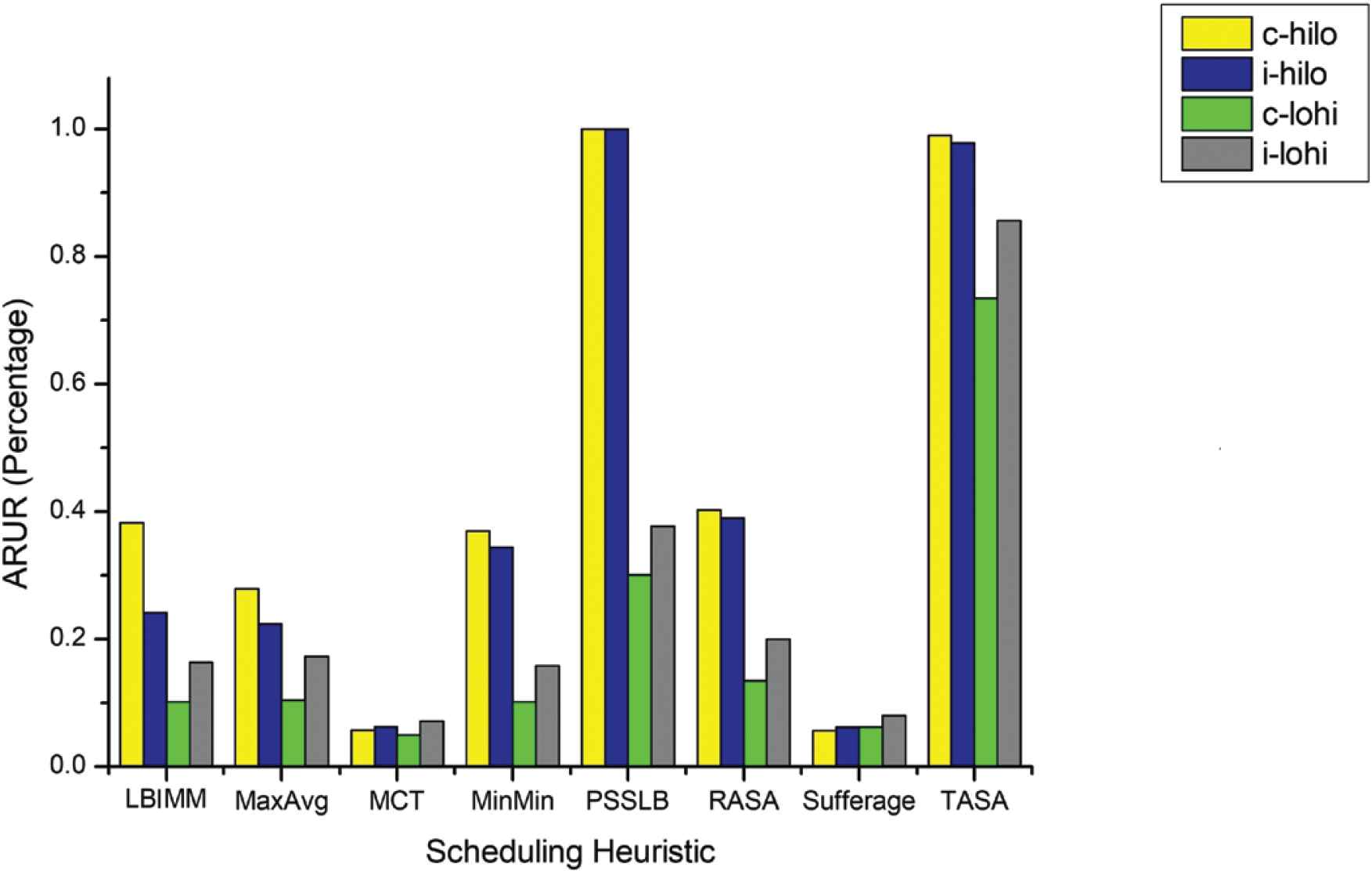 Figure 1 shows comparison results of ARUR using four instances i.e., i-hilo, i-hilo, i-lohi, and i-lohi of HSCP dataset for state-of-the-art static task scheduling heuristics. These algorithms include LBIMM, Max-Avg, MCT, MinMin, PSSLB, RASA, Sufferage, and TASA. Experimental results plotted in Figure 1 shows that TASA task scheduling algorithm outperformed LBIMM, Max-Avg, MCT, MinMin, RASA, and Sufferage in terms of ARUR for all the four instances of HCSP datasets. Its because, TASA is task-aware and adopt scheduling strategy based on tasks nature. The ARUR value of PSSLB is comparable with TASA for i-hilo and i-hilo instances of HCSP dataset. Similarly, the ARUR value of PSSLB is lower than TASA algorithm for c-lohi and i-lohi; however, higher than LBIMM, Max-average, MCT, MinMin, PSSLB, RASA, and Sufferage. The obtained results reveals that the Sufferage and MCT algorithms have lower ARUR values as compared with TASA, LBIMM, Max-Avg, MCT, MinMin, and RASA. The reason is that MCT overloads faster VMs while slower machines remain idle. On the other hand, Sufferage is also MCT-based and involve comparatively more complex computations. Experimental results asserts that TASA and PSSLB are more scalable as compared with other state-of-the-art task scheduling approaches.