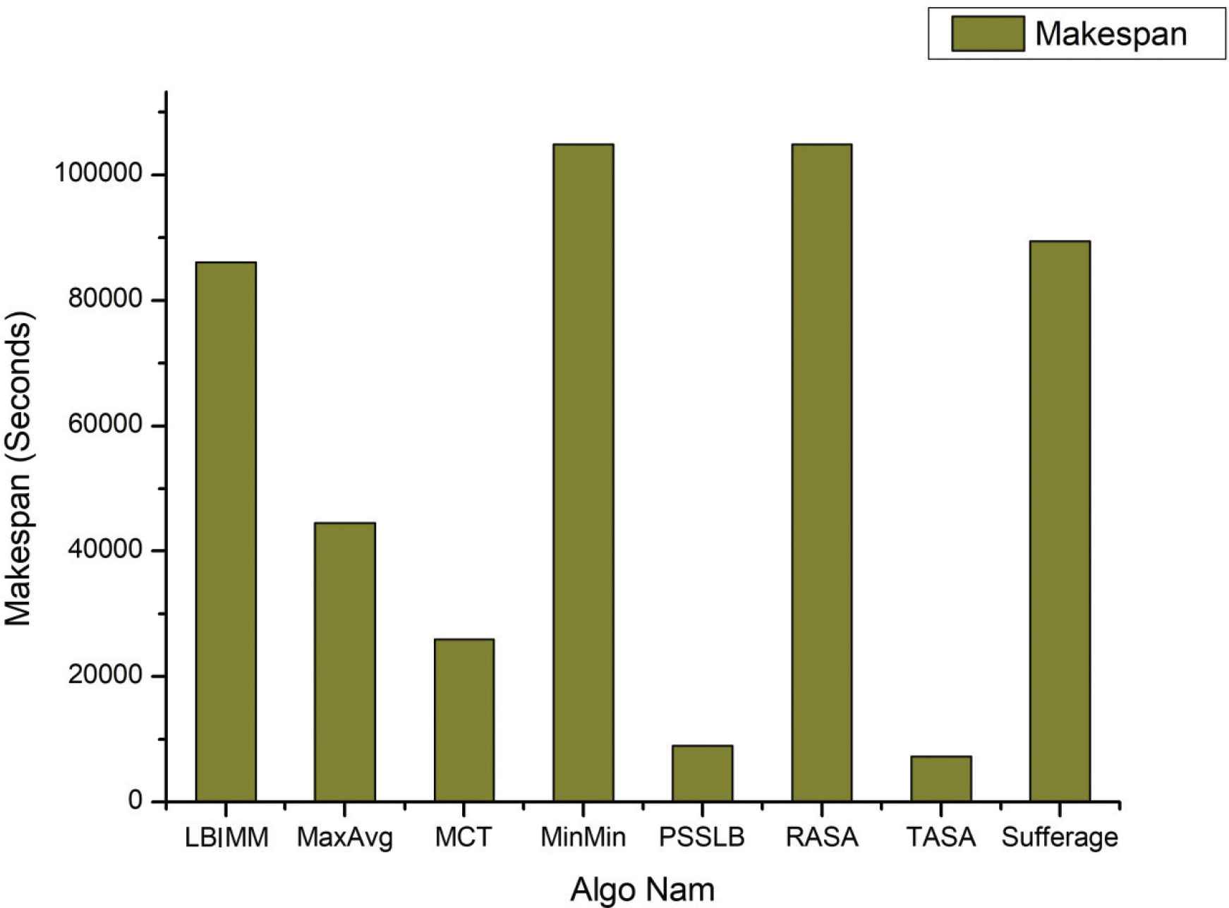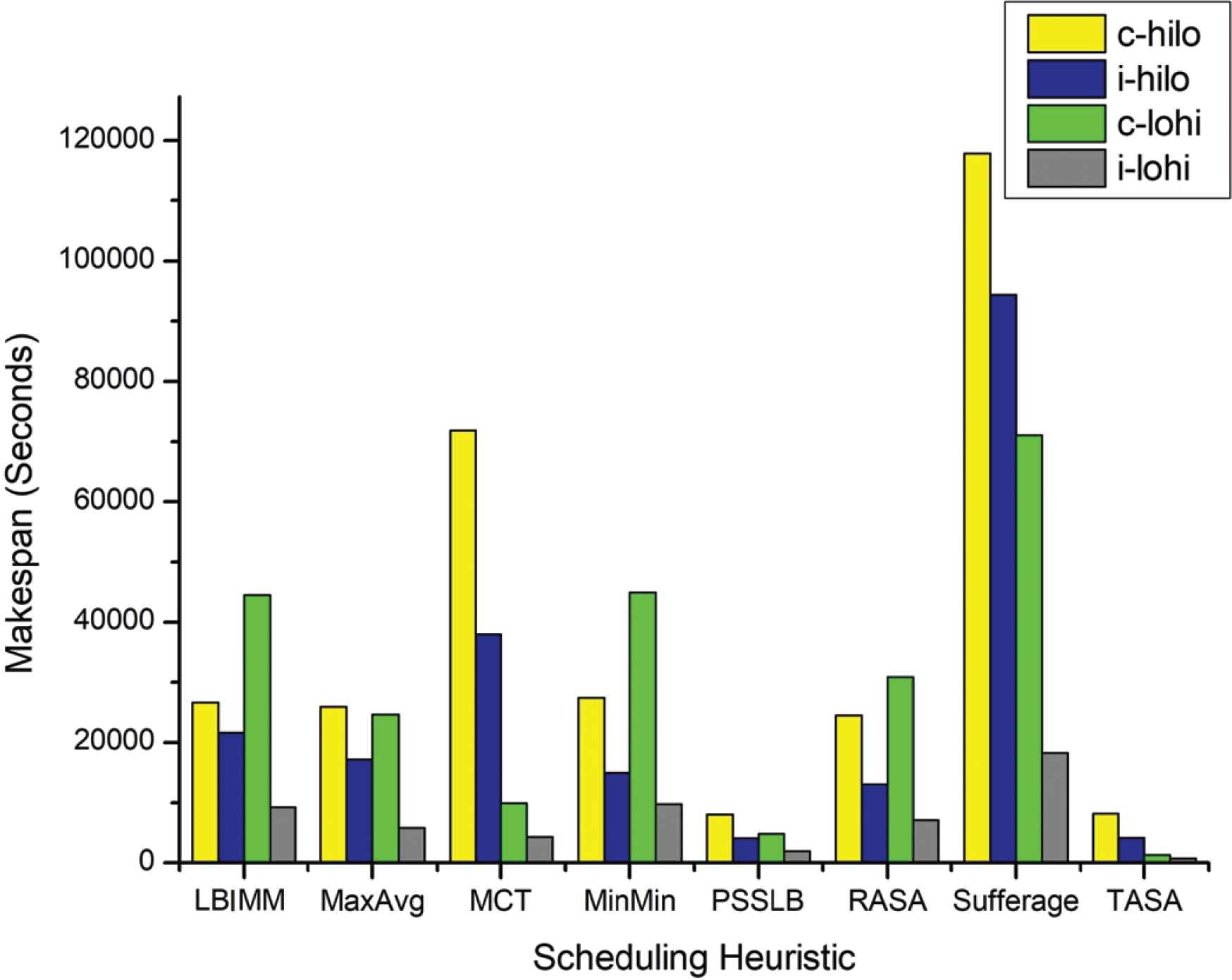 Makespan is the overall execution time and one of the most important parameters especially for Cloud service users in Cloud computing environment. Lower value of Makespan show better performance and vice versa. The results presented in Figure 2 reveals that TASA task scheduling algorithm outperformed Sufferage, PSSLB, MCT, Max-Avg, LBIMM, MinMin, and RASA. The reason behind is that TASA is a task-aware scheduling algorithm that combines best features of MinMin and Sufferage. MinMin algorithms favors smaller tasks and Sufferage enables to execute highly waited tasks in priority base. PSSLB has comparable Makespan to that of TASA and results in improved Makespan than the other state-of-the-art tasks scheduling algorithms. Results delineate that MCT has better performance in term of Makespan than LBIMM, RASA, Max-average, Sufferage, and MinMin for i-lohi and i-lohi instances of HCSP dataset, however, poor performance for i-hilo and i-hilo. This shows that MCT has better performance for datasets with small size tasks and poor performance for datasets with large size tasks. Due to the high scheduling overhead, Sufferage algorithm has poor performance in term of Makespan as compared with other tasks scheduling algorithms. The overall results show that PSSLB and TASA has better performance on all datasets and can be easily generalized and scaled-up.