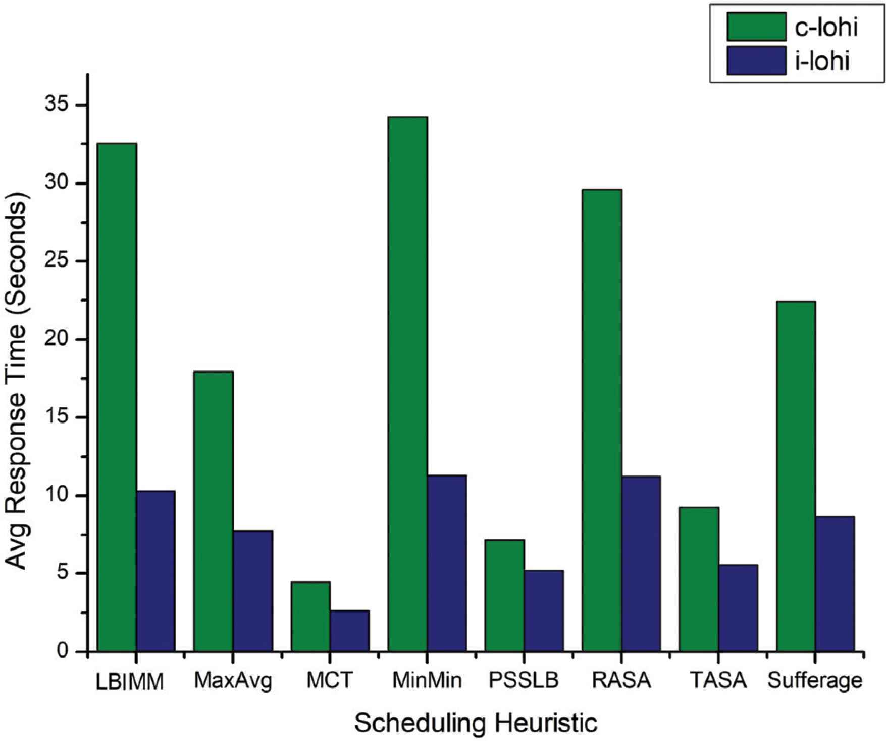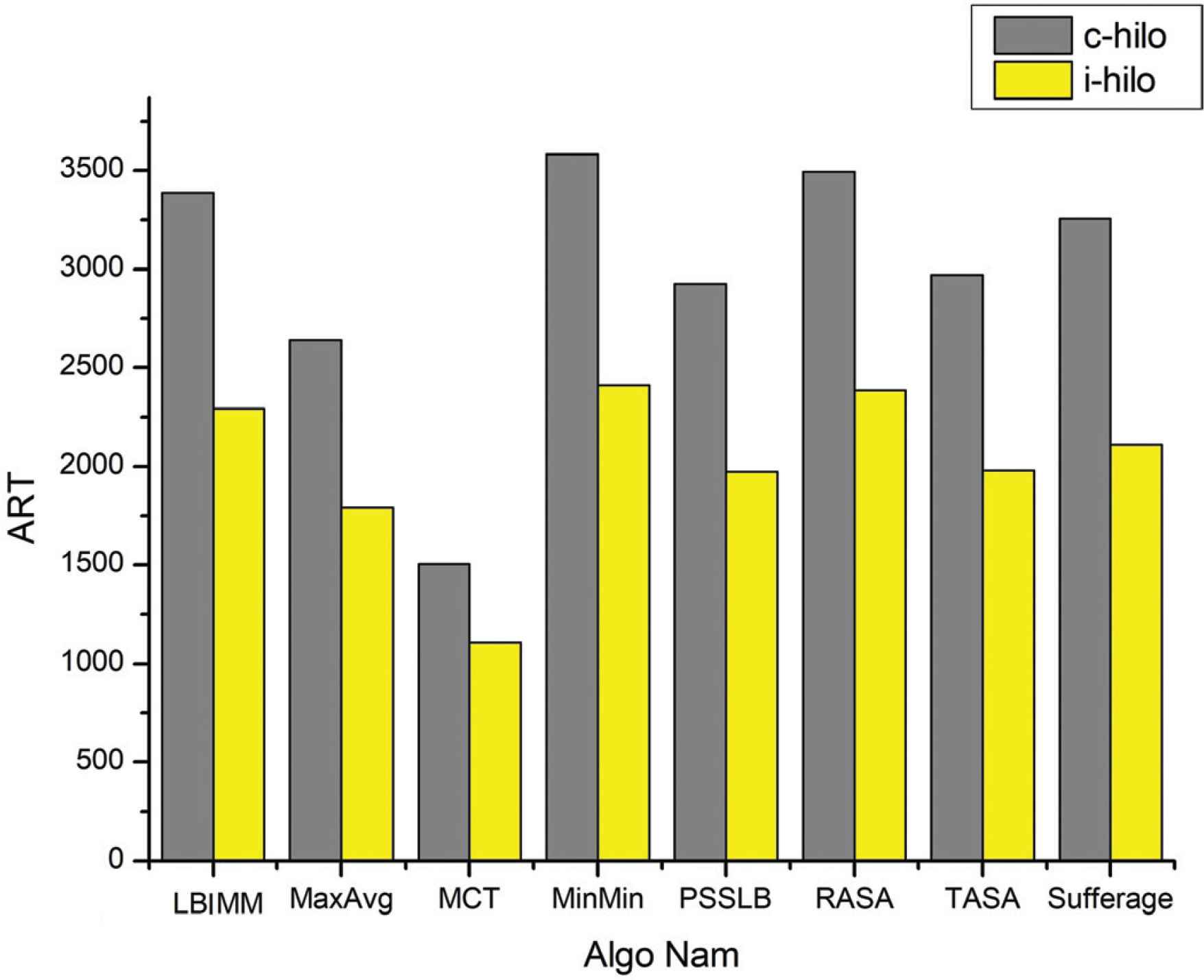 The result of the ART are plotted in Figures 4 and 5. In Figure 4, the results of hilo instances dataset are explained. The MCT attains the best ART results as compared with the rest of the scheduling approaches. This is because MCT harnesses the power of the fastest machines for each of the scheduling requests. Thus, MCT comes up with the best response time. However, leads to inefficient resource utilization as most of the slower machines remain idle during the task scheduling by the scheduler for MCT. The TASA, PSSLB, and Max-Avg showed the second leading performance results in terms of ART for both c-hilo and i-hilo dataset instances. The Sufferage scheduling approach has shown improved ART for the i-hilo instance. Figure 5 delineates the ART results for all the compared contemporary approaches on the lohi datasets. Once again, the MCT outperformed the rest of the compared scheduling heuristics in terms of ART. The MCT has been able to reduce the ART by 60% as compared with the TASA and PSSLB and about 400–600% as compared with the rest of the approaches. The TASA and PSSLB again revealed very good ART results as compared with the rest of the compared scheduling approaches.