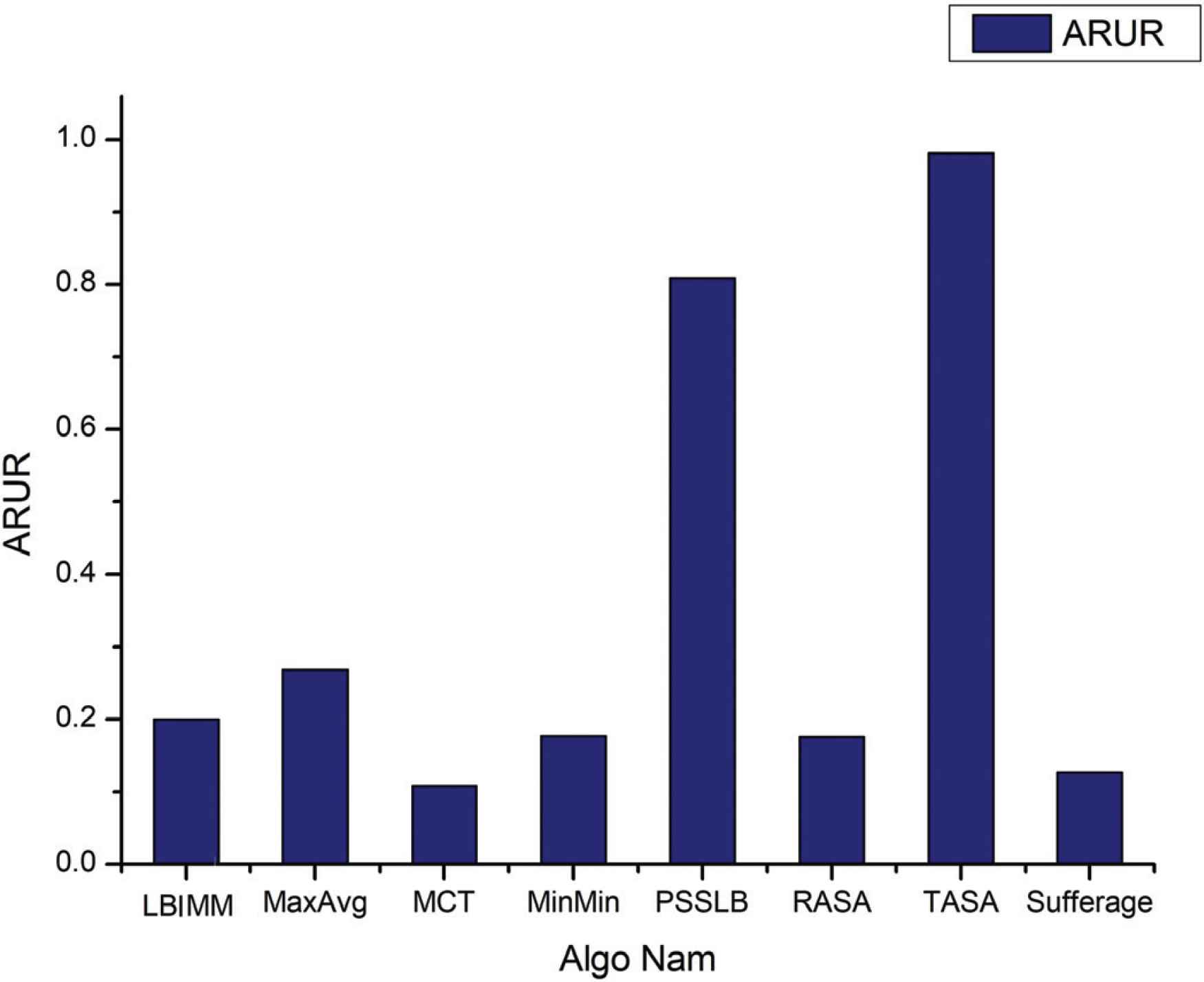 ARUR: The ARUR corresponds to average resource utilization by each of the heuristic during the complete execution of all the tasks on the available VMs as given in Equation (2).