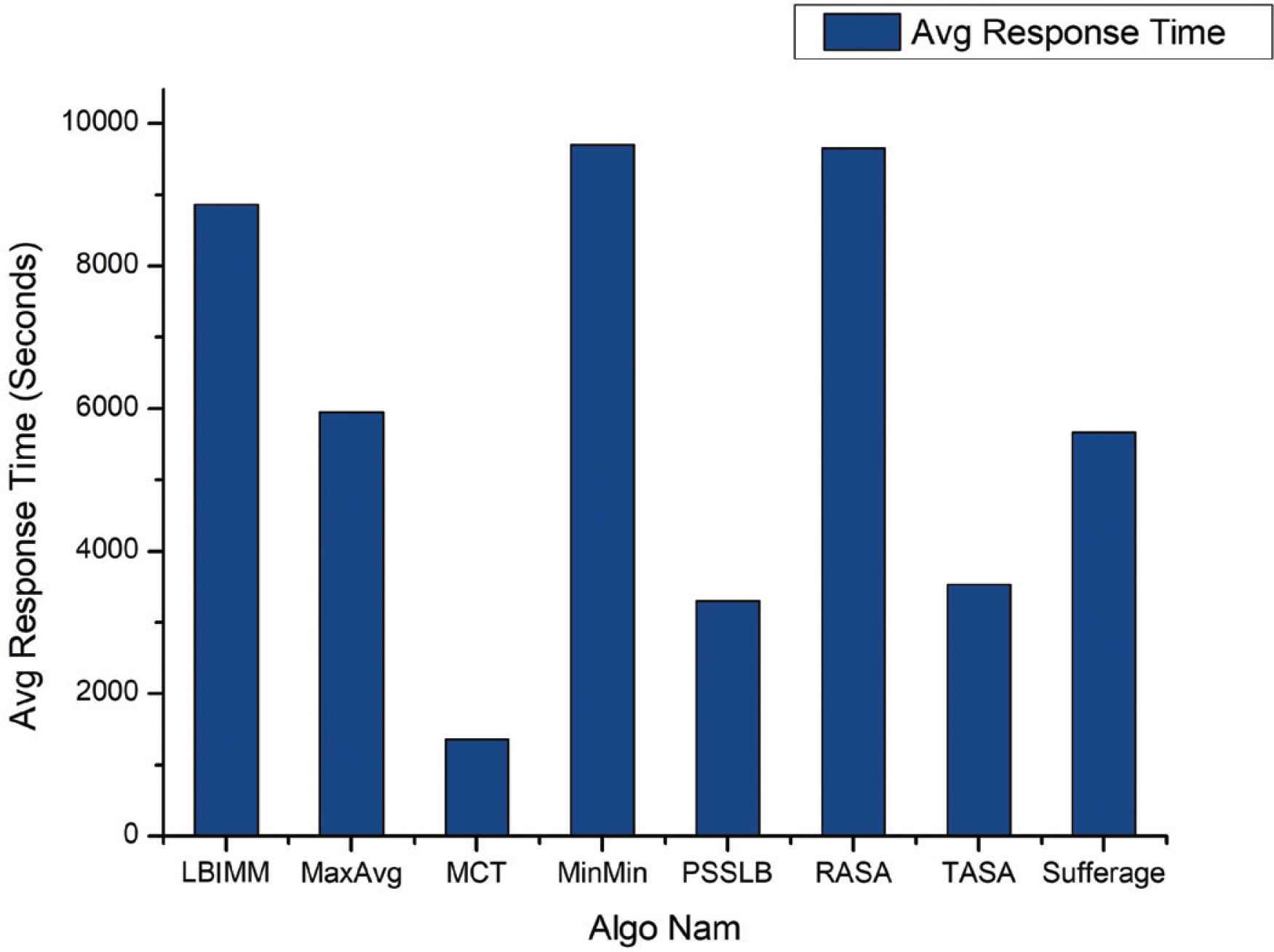 Figure 9 contemplates the ART results concerning all the contemporary task scheduling approaches. The RASA, MinMin, and LBIMM resulted in poor ART as compared with the rest of the approaches. The MCT approach has been able to dramatically reduce the response time and this behavior is due to the reason for harnessing the powerful VMs for each of the incoming task requests. However, this has resulted in two major issues: First, most of the low power VMs remain idle during the task scheduling execution. Second, the overall average resource utilization is hurt and seems to be several times lower as compared with the other approaches. The TASA and PSSLB are the most consistent approaches showing a moderate performance for the ART and thus are considered to be the most optimal choice for diverse datasets.