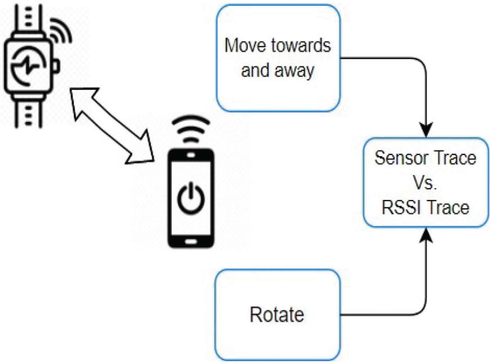 The shortcomings of IoT device hardware mentioned above can be conquered by using a proximity-based IoT device authentication called Move2Auth in Zhang et al. [8], in which the user operates few gestures in front of IoT device to authenticate securely while the IoT device is broadcasting radio signals as illustrated in Figure 3. Smartphone matches sensor trace with Received Signal Strength indicator (RSSI) trace to resolve if the device is within the proximity.