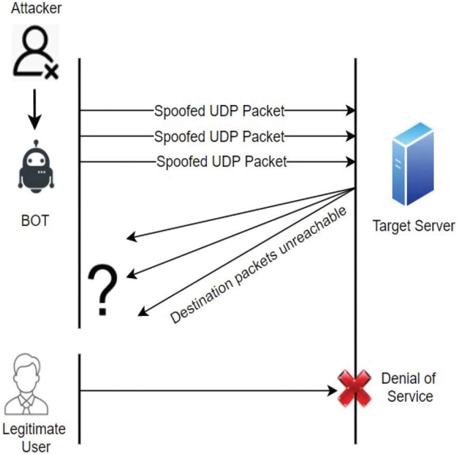 UDP flood attacks: DDoS attack when the intruder sends enormous number of UDP packet messages to target server to make the target server busy until it reaches the server’s request threshold and ultimately push the target server to go into a busy state and rejects all the legal traffic. As demonstrated in Figure 7 legitimate users or requests perceive this as server timeout or service is unavailable.