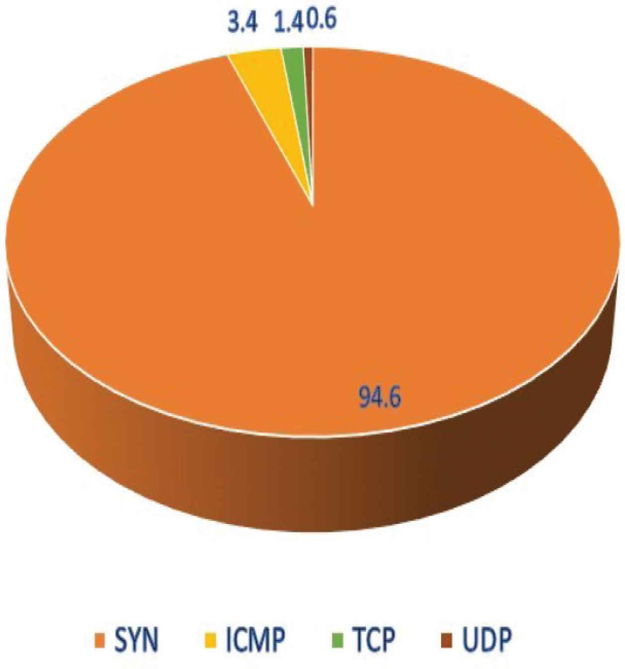 Syn Flood Attacks are the most common DDoS attack among all. Figure 8 shows the pictorial representation of various DDoS attacks depicted in pie chart using the 2018–2020 statistics [6]: