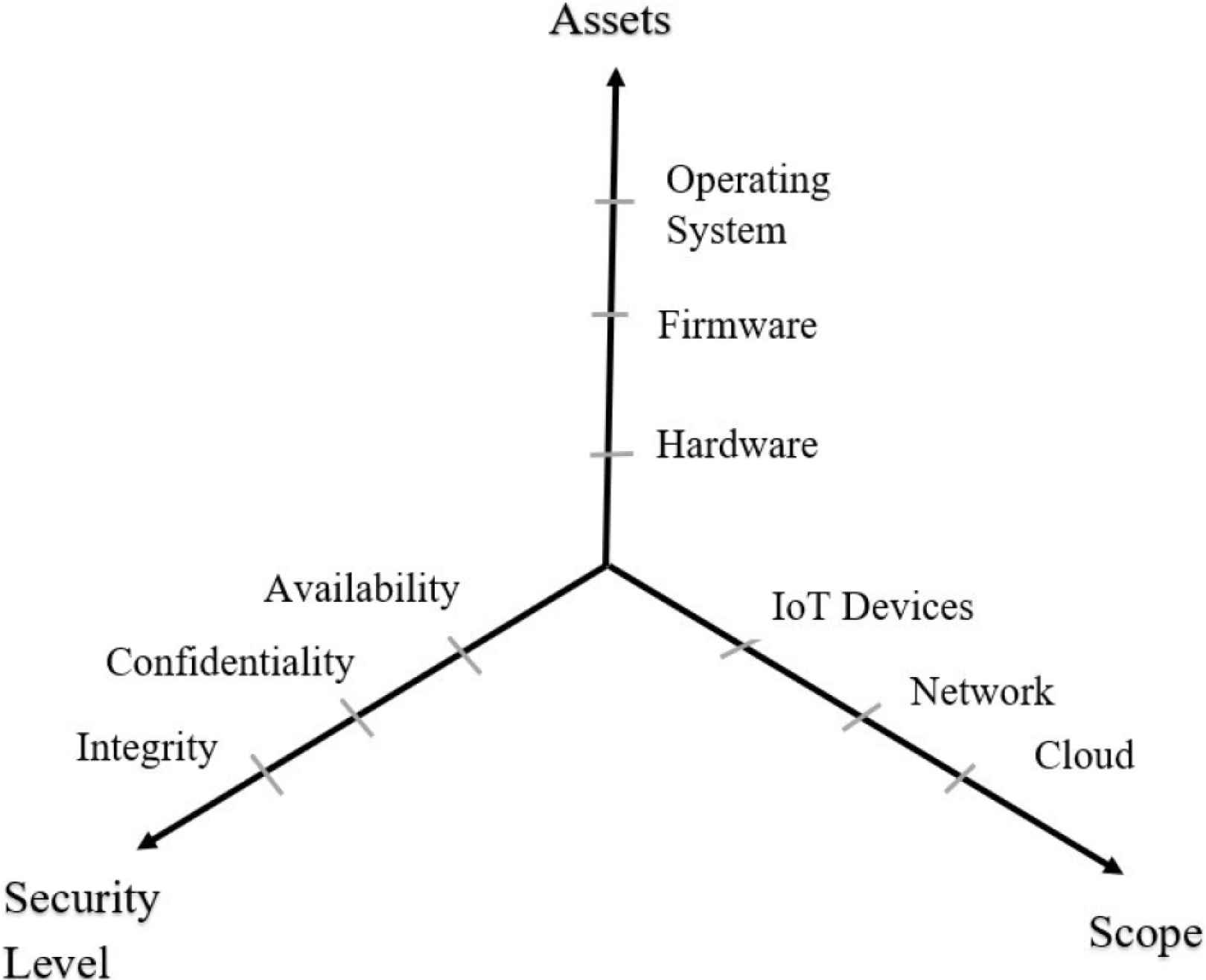 Proposed IoT threat model, with threats along three dimensions: Assets, Security Level, and Scope.