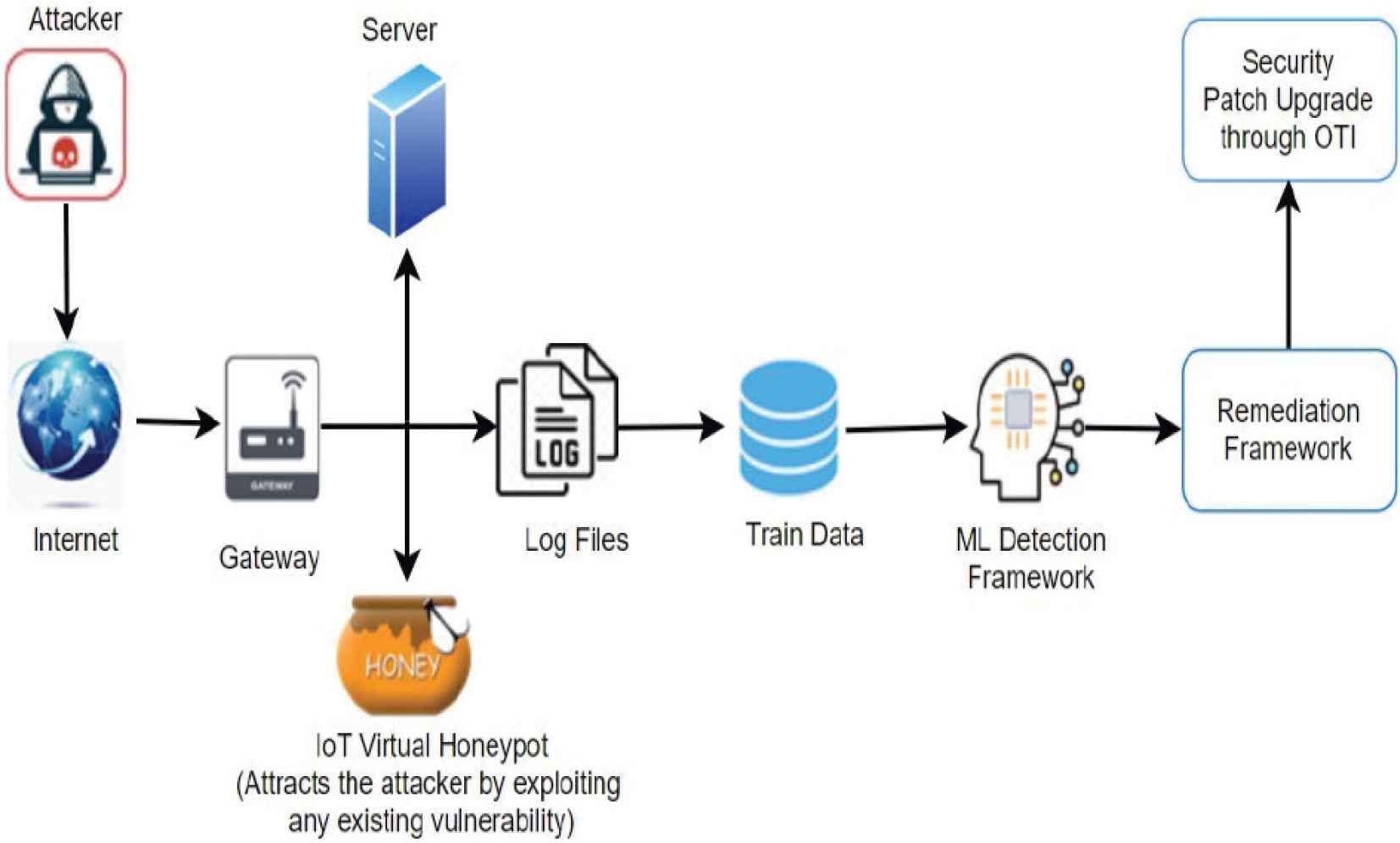 All in all, each Supervised and unsupervised learning typically fails to spot the attacks because of the insufficient training data, and not enough class features. And at the same time there is a need of monitoring attacks at real time and learn about new attacks and malware. Therefore, always there is a need of designing backup security solutions and integrate with ML schemes to provide stable and secure IoT services. Here honeypots can play an important role, honeypots as its name suggests, used for luring in attackers with an intention to observe and analyze their method of launching an attack by capturing information about the attacking agent like malware for a DDoS attack [32]. It is a device capable of getting compromised on the behalf of the main server by simulating any vulnerability which can easily be exploitable by an attacker. Either they can be used for carrying out any research to get knowledge of possible threats and shortcomings in the system called as Research Honeypots [32,33], or they can be used for protecting the company’s assets from the attacks in real time to improve the overall security called as Production Honeypots. Honeypots are quite effective in dealing with Zero-Day DDoS attacks without compromising IoT devices.