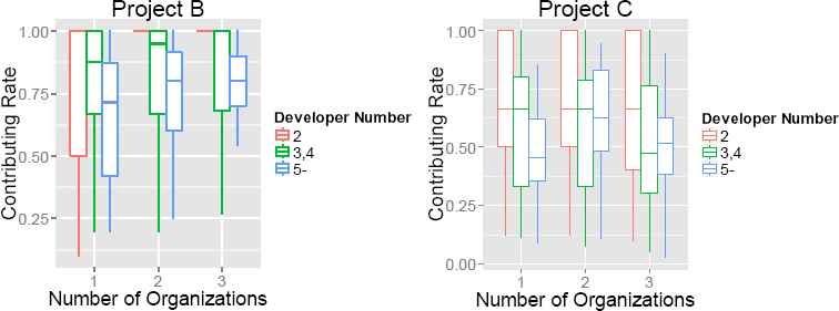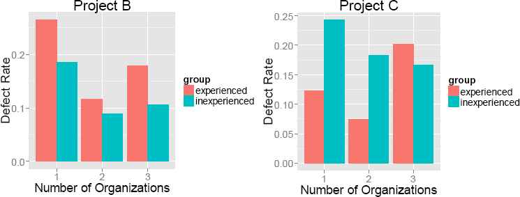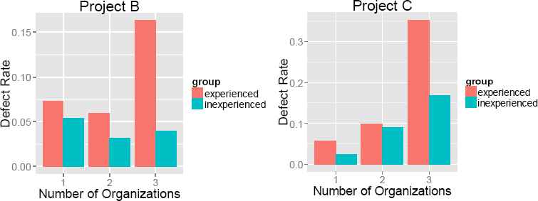 Figure 3 shows the rate of defect files edited by a single developer. An experienced developer means that the developer worked on a previous project. In some cases, experienced developers introduced slightly more defects. In many cases, they introduced fewer defects, especially if they are related with all three organizations. Thus, if a developer solely edits a file, few defects are introduced on the whole. However, inexperienced developers tend to introduce more defects in complex files due to the lack of experience.