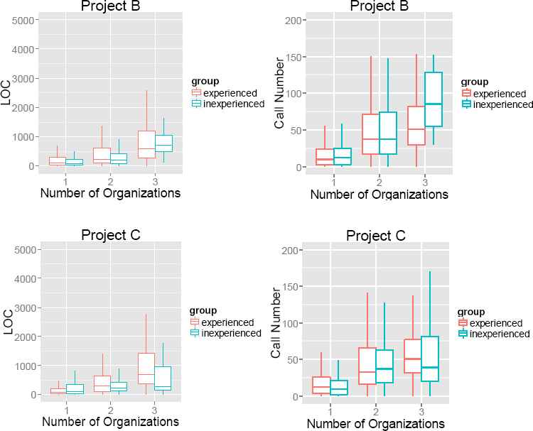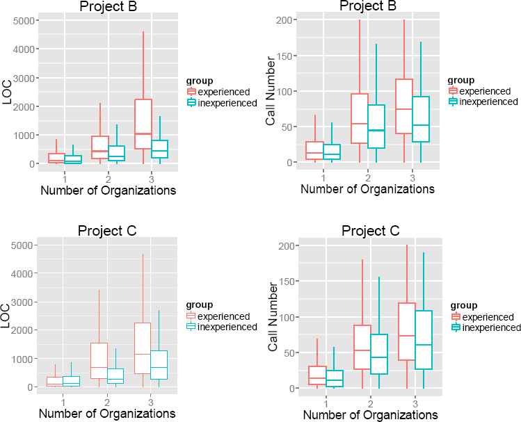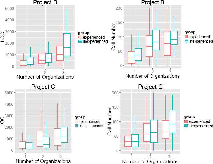 Figure 2 shows the metrics values of inherited files. In projects A and B, experienced groups have high metrics. Table 2 indicates that the Wilcoxon rank sum test with the alternative hypothesis set to “files edited by a file-experienced developer have higher product metrics than other inherited files in each type of origin (Number of organizations)”. It shows that most of the P-value are low. Although files edited by file-experienced developers are more defective, they are also more complicated.