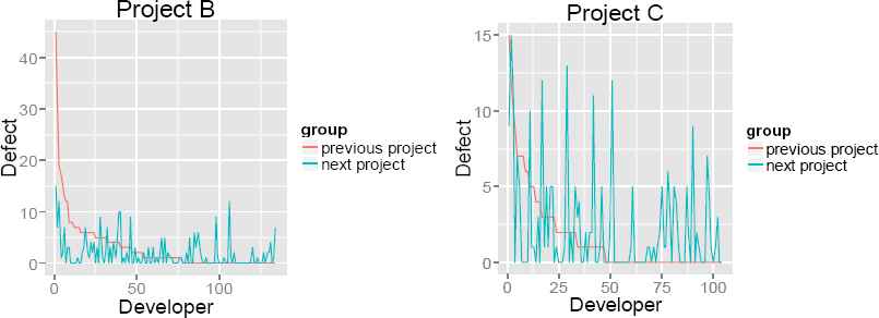 Figure 9 shows the number of defects by developer who participated in the projects continuously. The x-axis means the developer, while the y-axis shows the number of introduced defects. If developer X fixes two files to remedy a bug and both files are written by developer Y, we consider that developer Y introduced one defect. This graph indicates that developers, who did not introduce or only introduced a few defects, introduced many defects in the next projects. Therefore, introducing many defects in a previous project is not an indicator of introducing many defects in the next project.