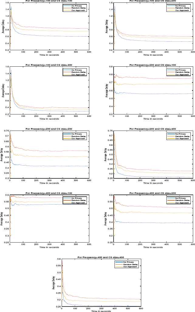 Fig. 5 and Fig. 6 show the performance of our countermeasure as frequency and CS size changes in case of uniform random delay and exponential random delay respectively. For the evaluation of our approach, we have chosen the average delay of all the flows in the network per second. As we increase the frequency of the consumer, the rate of arrival of the data packets also increases which leads to the decrement of CT. The value of CT increases with the increase in the size of CS as shown in Table 2. We can also observe the decrease in average delay as the size of CS is increased and the increase in average delay as the frequency increases. We can also observe that the best performance is achieved when no privacy is applied, this is the upper bound of the performance of the CS, but it does not have any privacy. In the random delay approach, the attacker would not be able to decide whether a request is served from the cache or by the producer, but the performance still degrades considerably. Our approach is better than the random delay approach.