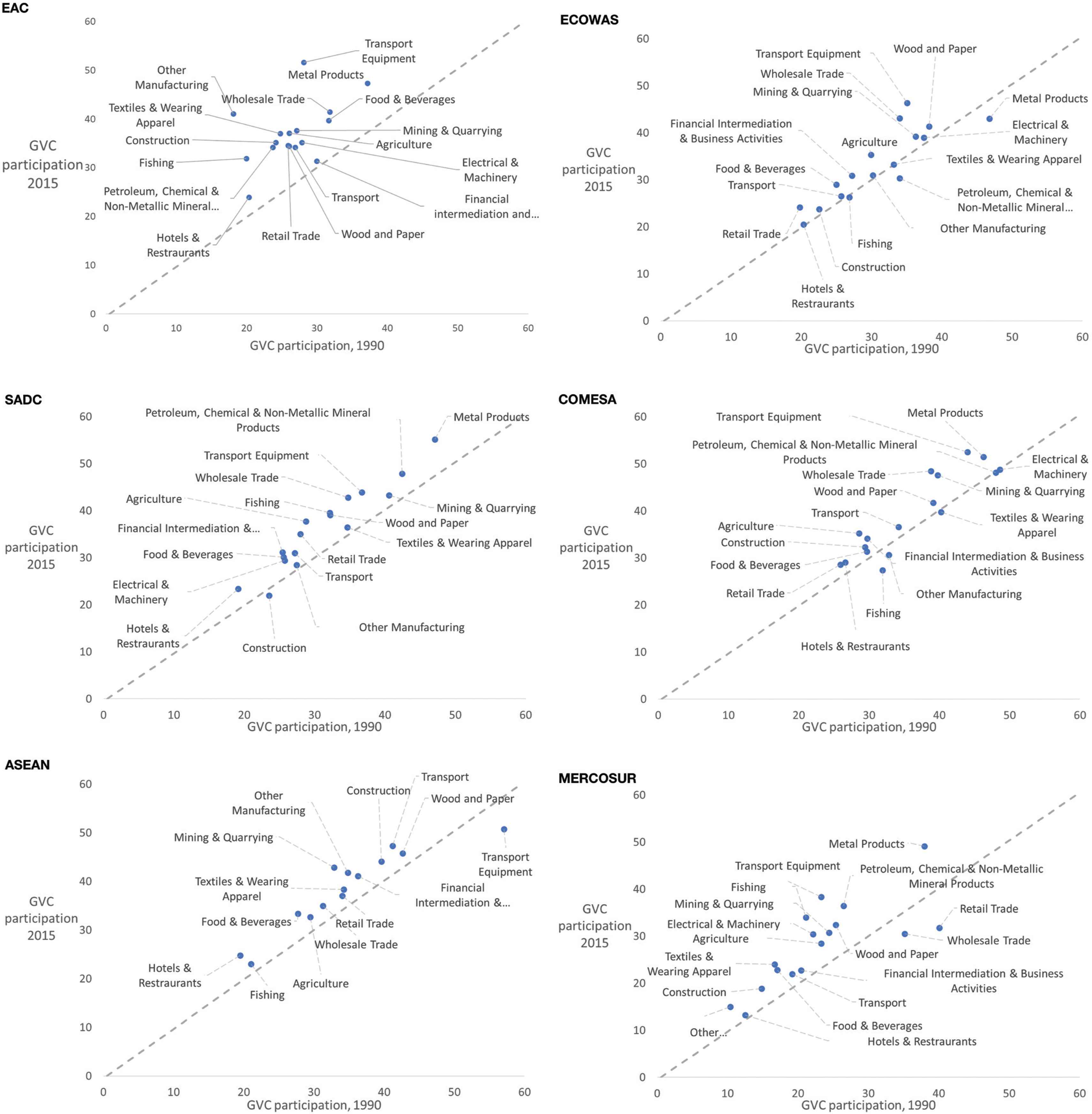 In the following section, we start with descriptive measures of overall GVC participation across four main African RECs (ECOWAS, SADC, COMESA, and the EAC), two comparator FTAs (ASEAN and MERCOSUR) and two major trade-dependent economies: China and India.
