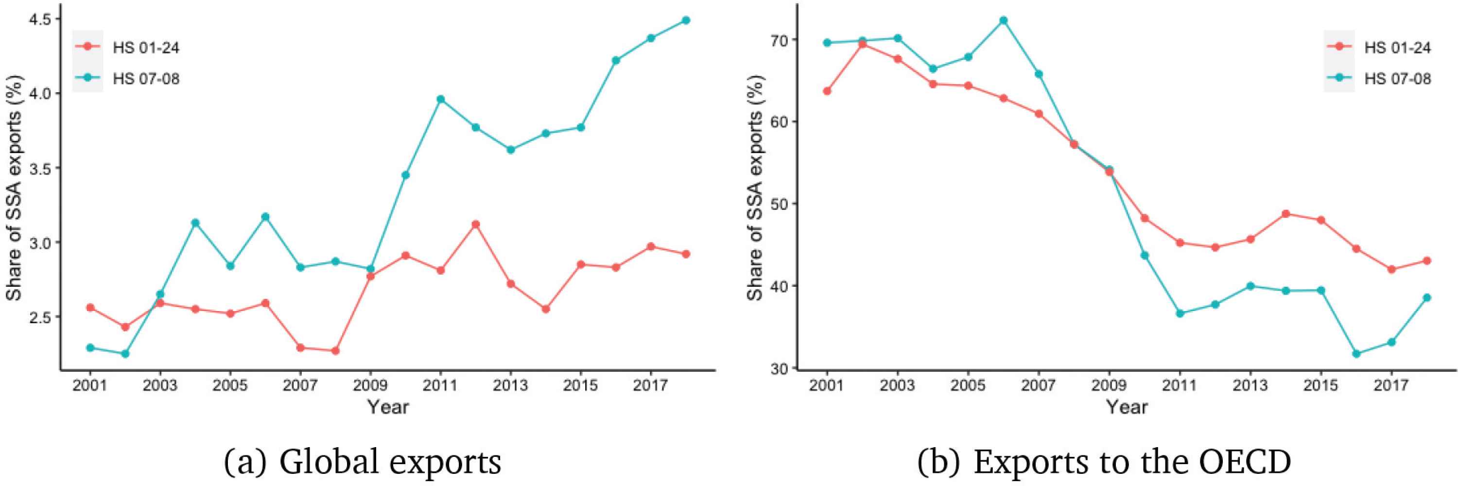 With approximately 70% of all least-developed countries located in sub-Saharan Africa (SSA), the threat (or otherwise) posed by standards to agrifood trade has direct implications for the region. For instance, agricultural exports are a mainstay of the economy in many SSA countries, yet the share of SSA’s agricultural exports in global trade has remained fairly stable over the last two decades (Figure 1a). Over the same period, the share of SSA’s high-value agrifood exports, such as fruits, nuts, and vegetables, has been steadily increasing, from 2.5% in 2001 to 4.5% in 2018. Despite this trend, the share of SSA’s agricultural exports to high-income OECD countries has been decreasing, especially for fruits, nuts, and vegetables (Figure 1b). This is despite the fact that over the last decades, many developing countries have witnessed structural shifts from exporting traditional cash crops to non-traditional high-value agrifood products, including fresh fruits and vegetables (Reardon et al., 2009). This contrast between decreasing exports to the OECD (Figure 1a) and the increasing share of high-value agrifood products in global exports (Figure 1b) raises a policy-relevant question: What are the possible reasons behind this phenomenon? In this study, we investigate empirically the role of standards imposed by high-income OECD countries on high-value fruits and vegetables. For example, 78% of all mangoes intercepted at the EU border in 2016 because of pest infestation were of African origin, and 46% of all interceptions at the EU border because of a failure to show SPS-related certificates were from Africa (Grumiller et al., 2018).