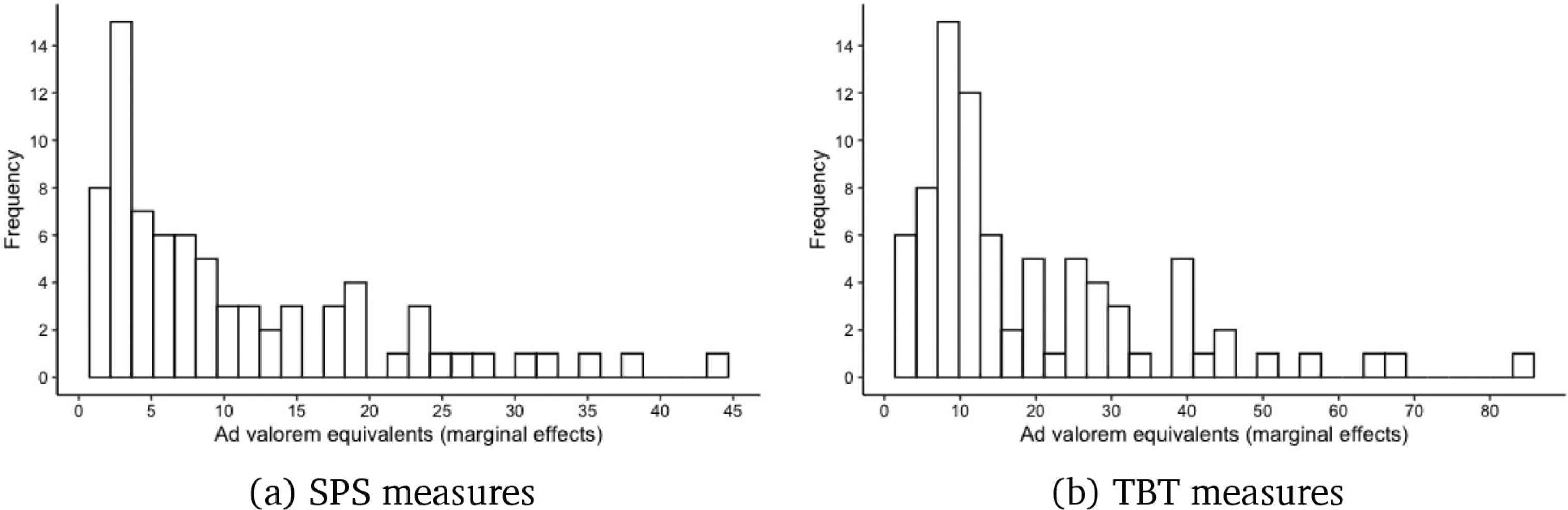 The values we report in Table 1 are comparable with existing works. However, for all product groups, our SPS AVEs lie below that for TBT measures. In Cadot and Gourdon (2016), the total cost of complying with SPS—which is what they estimate by using dummy variables—is higher than the total cost of complying with TBT. However, the marginal cost of one additional SPS measure—which is what our count measure captures—is smaller than the marginal cost of one additional TBT measure. Our finding is reinforced by Cadot et al. (2018b), however, who also use counts of NTMs and show that the AVE of SPS measures lies well below the AVE of TBT measures in Sections 1 and 2. The differences we observe may also be due to differences in the empirical approach—the papers by Cadot and his co-authors use cross-sectional data and report section averages instead of medians. Figure 2 shows the distribution of AVEs for the whole sample for SPS and TBT.14
