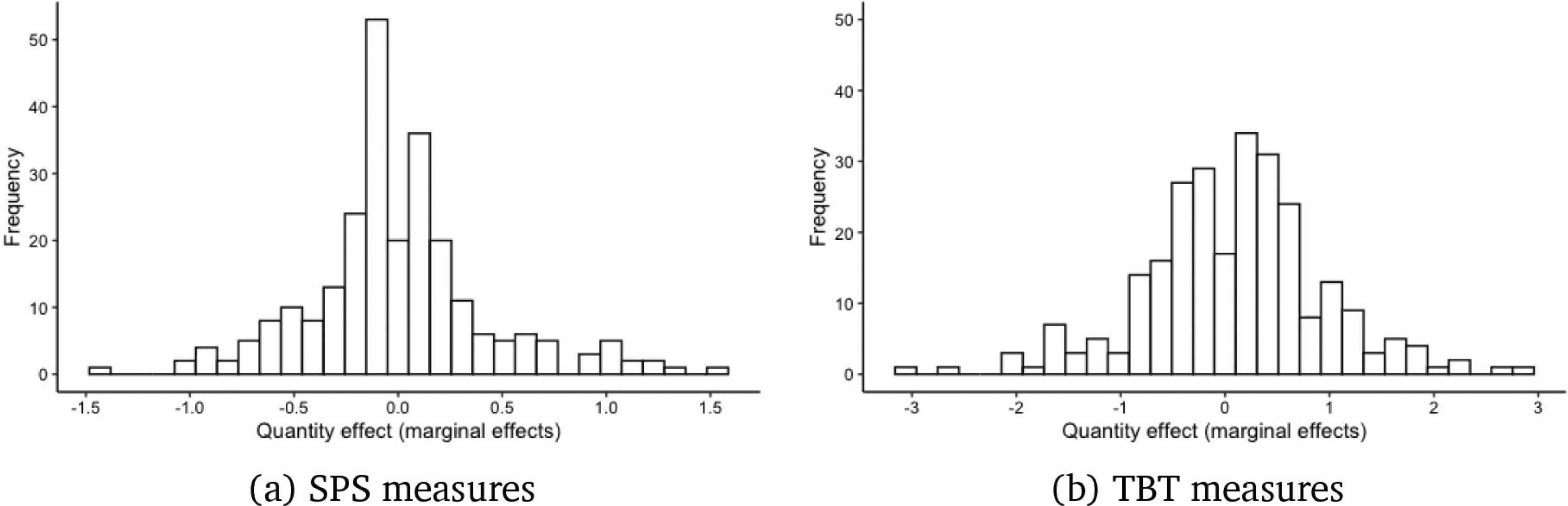 Distribution of changes in trade volume at the country–product level. Notes: This graph shows the distribution of statistically significant quantity estimates for all country pairs and products (HS01–HS24). For the SPS and TBT measures, we obtained 272 and 273 statistically significant trade-volume effects, respectively. The general observation is that standards have both trade-enhancing (positive marginal effects) and trade-impeding (negative marginal effects) effects.