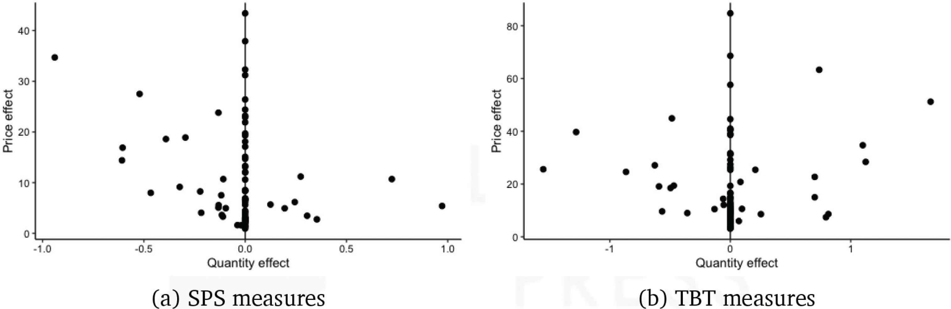 Equilibrium changes in trade volume and prices for agricultural products. Notes: Panels (a) and (b) show combinations of price and quantity estimates obtained from regressions with country-pair FE and year fixed effects (Equation 4). Here we focus on products for which our SPS and TBT measures have a cost- raising effect, i.e., products for which price regressions produced a positive and statistically significant SPS and TBT effect. For example, if the estimated SPS coefficient for product 101105 in the price equation is either statistically insignificant or negative, then the product is not reported in the equilibrium graph. However, if the estimated coefficient is positive and statistically significant, then the AVE is reported on the y-axis and matched with its corresponding quantity estimate on the x-axis. For SPS and TBT measures, we have 81 and 87 positive and statistically significant unit value estimates, respectively.