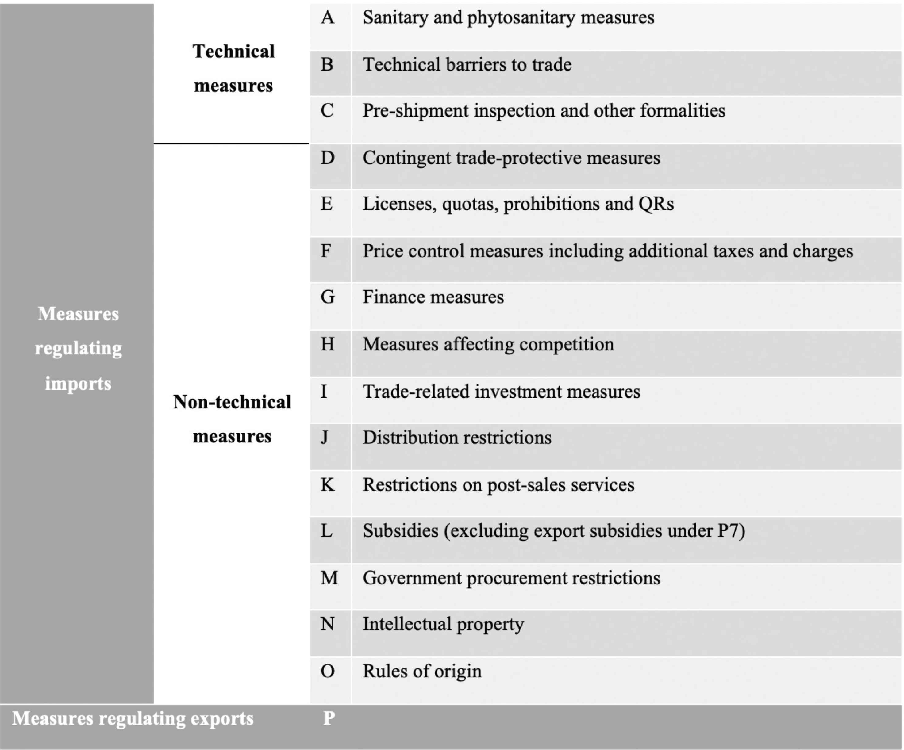 Xsijt varies depending on which of the two economic effects, prices (Psijt), or trade volumes (Qsijt) we consider. SPSsijt and TBTsijt are respectively the number of SPS and TBT measures imposed on HS6 digit level product s exported from i to importer j in year t. The superscripts A and B on β1 designate type A (SPS) and type B (TBT) NTMs using UNCTAD classifications. The superscript C designates all other NTM types excluding export measures (Figure A1 in the appendix). Following recent literature (Murina and Nicita, 2017; Cadot et al., 2018b; Sanjuán et al., 2019), our NTM variable is the count of one-letter, three-digit NTMs (A110, B120, etc.) for each category in a trade dyad.7 Following Peci and Sanjuán (2020), our NTM variables are not log transformed. Thus, β1 captures marginal effects and not elasticities. NTMs in general are endogenous to trade volumes (Looi Kee et al., 2009). The reasoning is that the more an agricultural product is imported, the higher the incidence of SPS measures, as policymakers try to safeguard the health of domestic consumers (Murina and Nicita, 2017). The trade and price effects of NTMs may also occur with some delay. Hence, we lag our NTM variables by one period to account for possible reverse causality (Ferro et al., 2015; Niu et al., 2018). Endogeneity due to omitted variables is controlled for using the country- and product-time fixed effects.