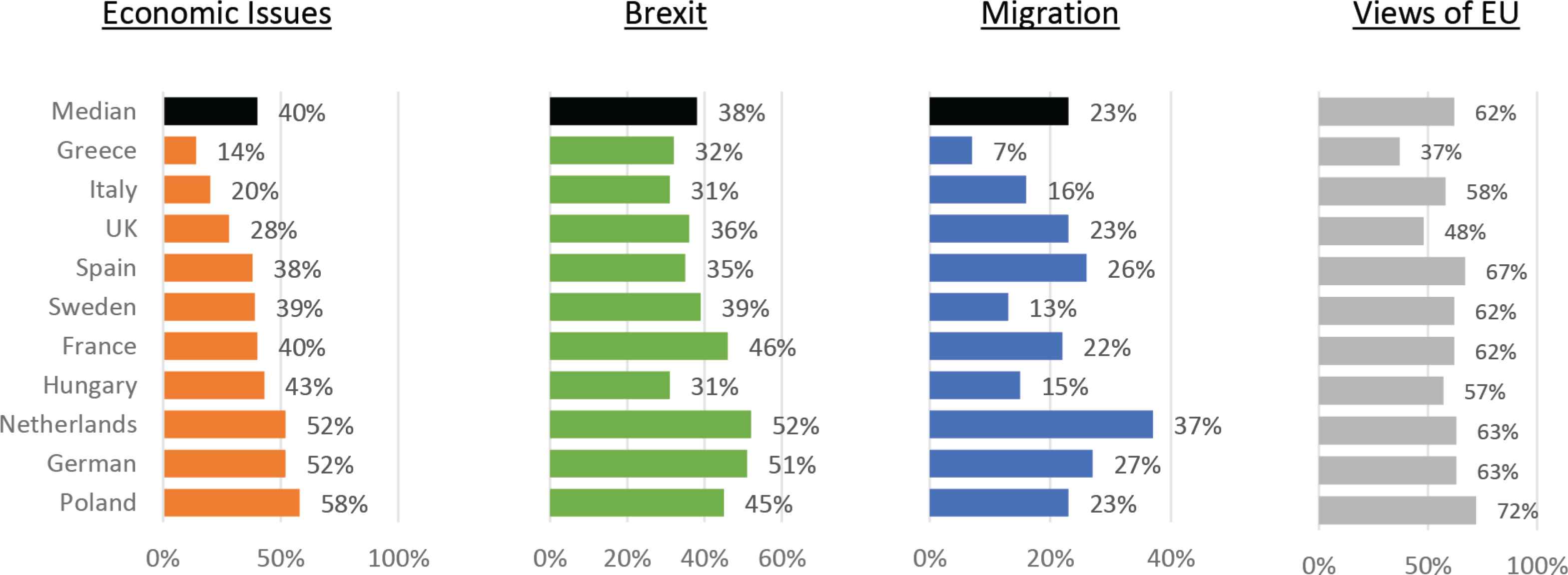 Public opinion of the European Union’s handling of economic and social issues (2018). Percentage of the population that believes the EU has handled these issues well or very well. Views of the EU reflects the percentage of the population with an overall favourable view of the EU. Source: Pew Research (2019).