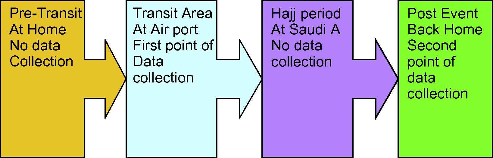 Eligible participants included in the study were all pilgrims, including men and women, who were in transit areas carrying ID numbers issued by the Ministry of Religious Affairs, and those ready to travel to Saudi Arabia. Subjects were selected systematically using either the lists provided by the Ministry of Religious Affairs (e.g., every 20th Hajji on the list) or seats of the bus booked for each traveler arriving at the transit area (e.g., seats 3, 12 and 27 on each arriving bus).