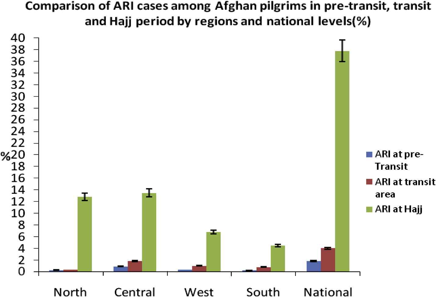 Results: The occurrence of diarrhea and jaundice remained constant over time. However, ARI increased from 1.4% at pre-transit to 4% at transit area and 37% during the Hajj. ARI rates among residents from the Central and Northern regions of Afghanistan were significantly higher at the post-Hajj stage, at 50% and 69%, respectively. There was no difference in ARI by sex among Hajjis.