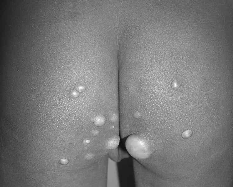 A 2-year-old male child was brought to the clinic by the grandparents with complaints of progressive eruption of multiple nodules over the peri-anal area and buttocks over the last 4 months. He never suffered from any serious illness since birth, was on mixed feeding (breastfeed and cow’s milk feed) from the beginning, and routine immunization was incomplete. He did not receive any injection or blood transfusion and any history of sexual abuse was denied. On further interrogation the grandparents revealed that the child was delivered full term at home and cried immediately after birth. Birth weight was not recorded but he was average in size. The mother was a 22-year-old primigravida whose pre-pregnancy health status was apparently normal. Antenatal period was uneventful, she did not seek any antenatal care, and no investigation was done. She fell ill 6 months after the child’s birth and was diagnosed with pulmonary tuberculosis by a local medical practitioner. She received some treatment but did not respond to it and succumbed to death after 4 months. The father of the child also developed similar complaints and died 5 months after the mother. The grandparents did not disclose any other information and no documents were produced. The HIV-status of the parents was not known. They were residents of a far-off village and their socioeconomic status was poor.