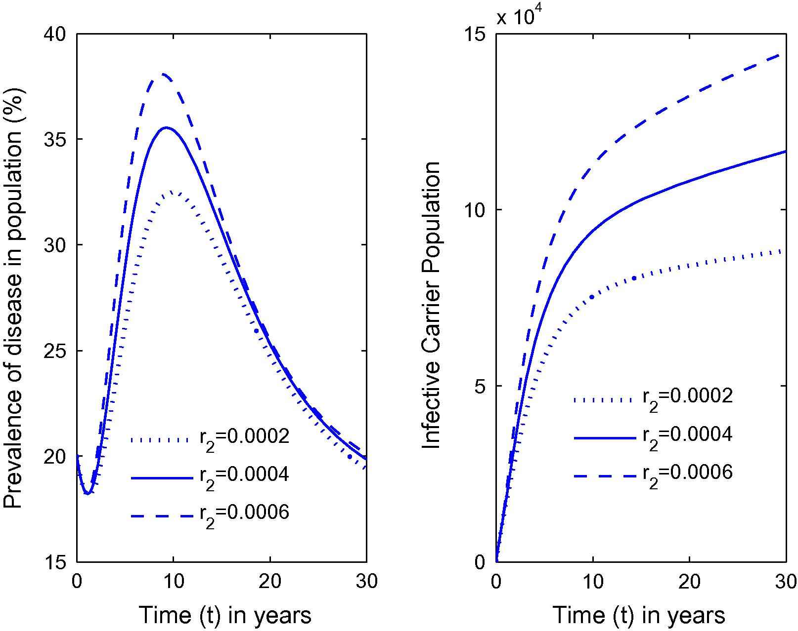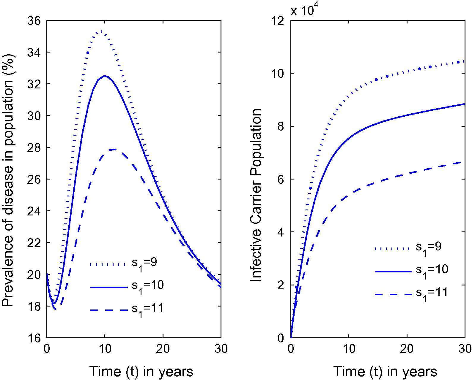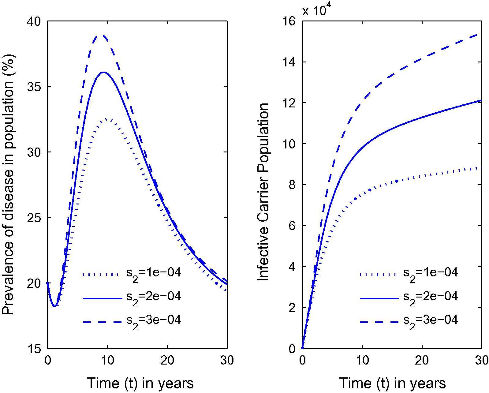 Keeping in mind the properties of E*, it was found that as the cumulative density of habitat characteristics increases, not only the infected carrier population density increases, but also the number of infected in the population increases leading to the rapid spread of typhoid fever. These results can be found after calculating dY/ds2, dCi/ds2, dY/r2 and dCi/dr2; all of them were found to be positive.