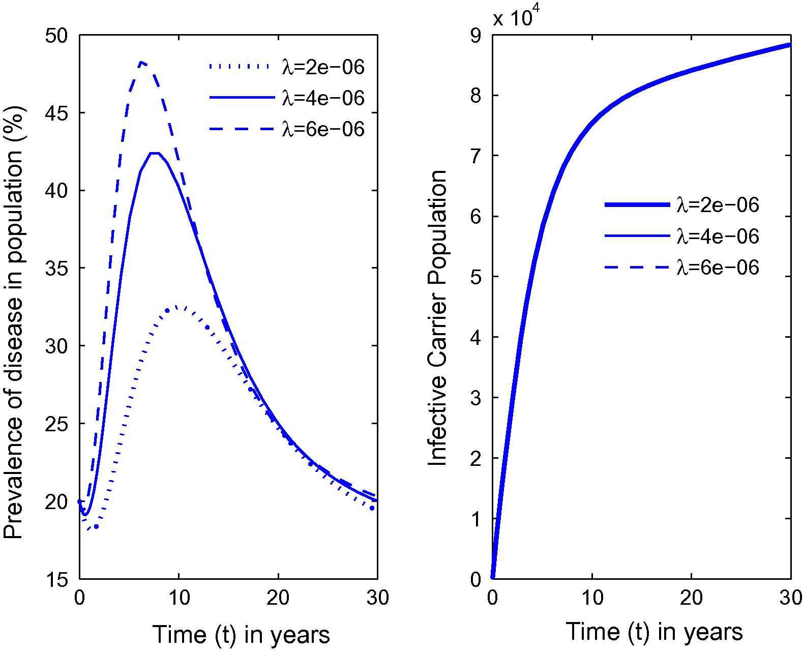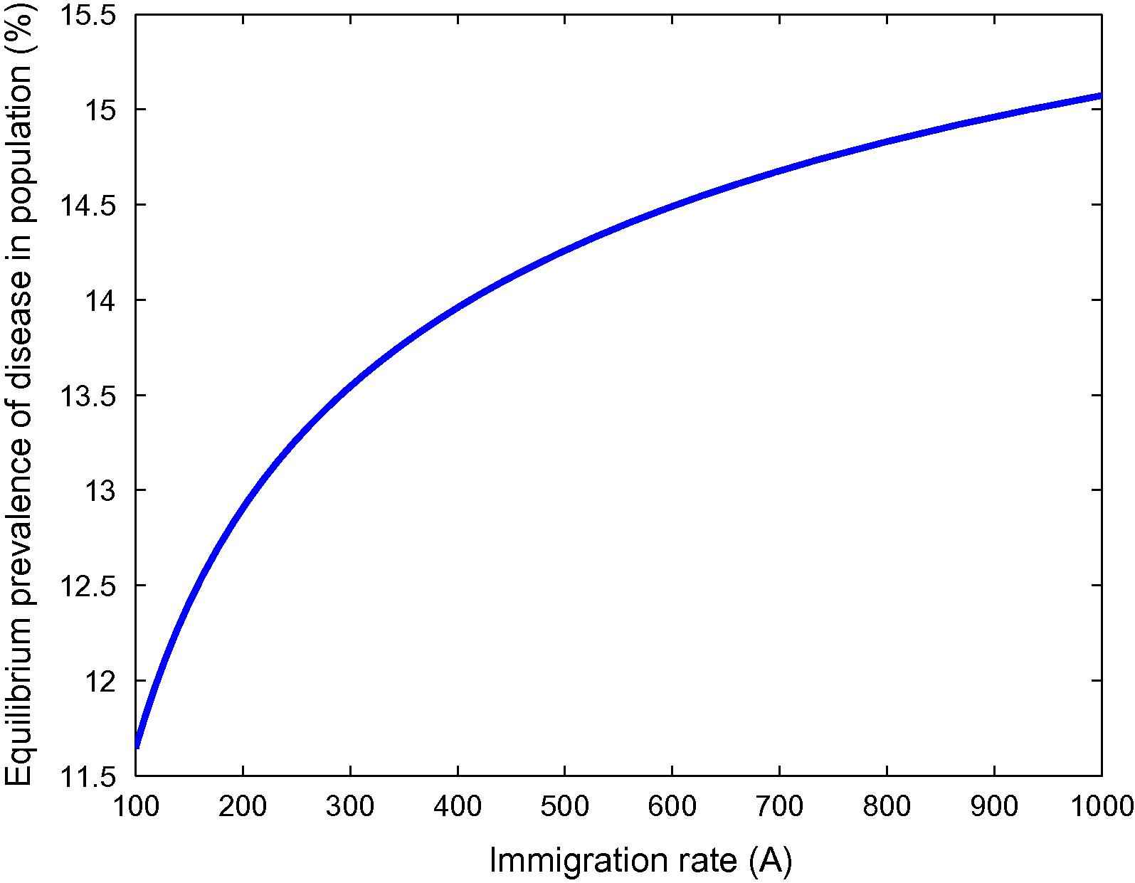 From Fig. 1, it can be seen that as the habitat characteristics conducive for the carrier population growth increase due to population increases, carrier population as well as prevalence of the disease in the total population increases. Further, similar results are noted for s2, s1 and λ from Figs. 24 respectively. Thus, it is clear that the infected human population density increases as the growth rate coefficient of cumulative density of habitat characteristics and the growth rate coefficient of the same due to human population density-related factors increase. The equilibrium value of prevalence of disease was further calculated for different immigration rates in Fig. 5 and it was found that as the immigration rate increases, the spread of disease also increases. Therefore, it can be concluded that immigration also plays a major role in keeping the disease endemic. Based on these results, it can be suggested that in highly endemic regions, it is very important to suppress the conducive environment for the carrier population generated by the human population by creating awareness within the population and applying external measures to control it. It is also important to note that this study is different from the previous studies [21,26,27]. The key issue addressed here is the effects of habitat characteristics (which are highly dependent on the human population) on disease prevalence which is different from the issues addressed (ecological and environmental effects on disease prevalence) in previous articles [21,26,27]. It is also noteworthy here that the modeling approach in this article is an improved version of the model in articles [21,26] by separating the carrier population into infected and susceptible classes and by inclusion of a separate class representing habitat characteristics dependent on total population, while Singh et al. [27] did a case study on Malaria with a different model than the one proposed here. The current study will fit in with the case of Bangladesh where, due to high population pressure, the quality of life is pretty low, which has helped Bangladesh to be highly endemic [25]. Provided with the appropriate data, the model can be employed to draw some predictions on control measures in these highly endemic regions that also constitute future work in this area.