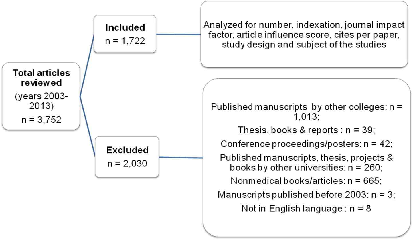 Application of Level 4: studies were included if they met the following criteria: (1) published manuscripts by the CMKSU in English language from January 1, 2003 to December 31, 2013, in indexed and unindexed journals; (2) principal authors from the college of medicine and its affiliated hospitals (King Khalid university hospital and King Abdul Aziz university hospital, Riyadh, KSA); (3) if the Principal author was from the college of the KSU other than the college of medicine, then at least one coauthor should be from the college of medicine, KSU; and (4) if the principal author was from the institution other than the KSU, then at least one coauthor should be from the KSU, college of medicine, or its allied hospitals. The following were excluded: (1) books, project reports, manuals, or unpublished manuscripts/thesis documents; (2) conference proceedings in the form of abstracts or posters; (3) manuscripts/books not related to medicine; and (4) principal author and coauthors from the institution other than the CMKSU and its allied hospitals.
