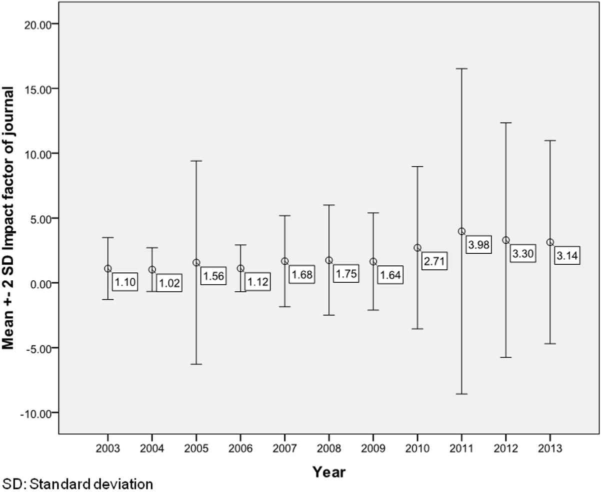 The IF of the journal was available for 92.6% (n = 1594) studies. The mean IF (standard deviation) was found to be 2.6 (4.1), the minimum being 0.018 for an unindexed journal called “Medical Channel” and the maximum 51.66 for an indexed journal “New England Journal of Medicine (NEJM)”. The highest average IF was found in the year 2011 (an average of 3.9), which was significantly higher than those found from the years 2003–2010 (p < 0.001), but was not significantly different from those found for 2012 and 2013 (Fig. 3). AIS was available for 70.9% (n = 1221) studies. The average AIS was found to be 1.16 (2.23), the minimum 0.02, and the maximum 21.49. The highest average AIS was found for the year 2011 (an average of 1.9), which was significantly higher than that for years 2003–2009 (p < 0.001), but statistically similar to that for years 2010, 2012, and 2013 (Table 1). The average cites per document was 10.06. The highest cites per document was found for the year 2004 (17.32), p < 0.001 (Table 1).