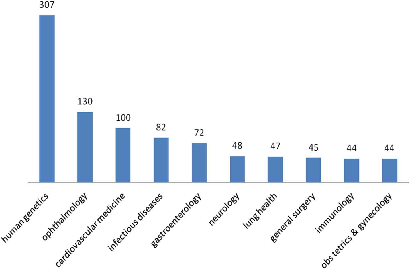 The highest number of studies were observational in design (76.02%, n = 1309) followed by reviews and meta-analysis (13.94%, n = 240), intervention and experimental studies (9.18%, n = 158), and others including comments, surgical techniques, debates, and editorials (0.87%, n = 15). According to the content of the studies published from 2003 to 2013, the highest number was that of studies related to human genetics (17.8%, n = 307), followed by ophthalmology (7.5%, n = 130), and cardiovascular medicine (5.8%, n = 100) (Fig. 4).