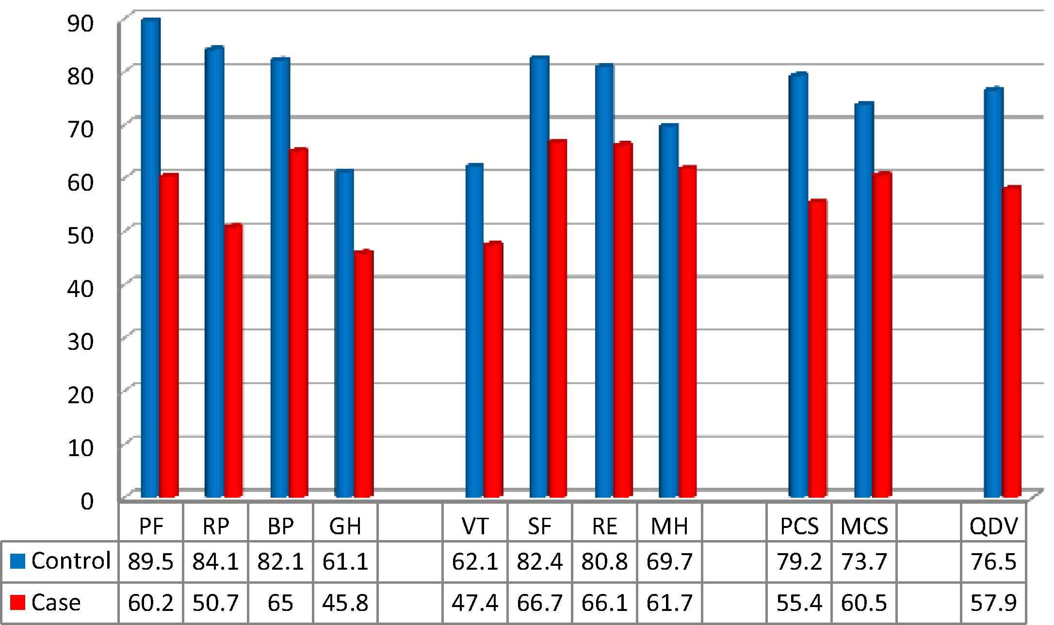 The eight dimensions, their two components summaries (PCS and MCS), and the overall QOL score were significantly lower among patients with dyslipidemia (p < 0.001) than among nondyslipidemic individuals.