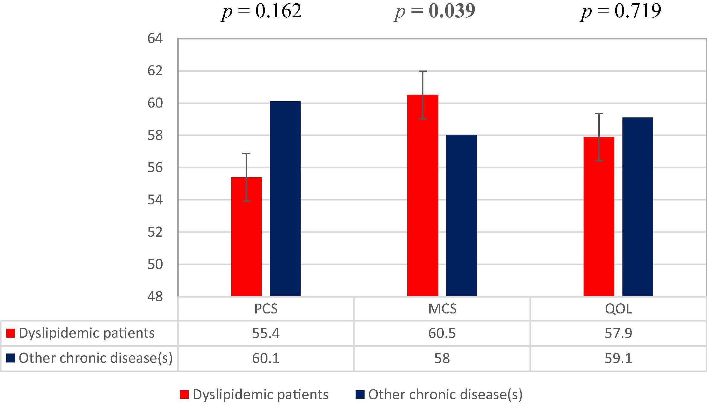 Figure 2 shows that among patients with chronic diseases, a significant difference exists only in the MCS between dyslipidemic patients (60.5 ± 22) and those with other chronic disease(s) (58 ± 25.2; p = 0.039).