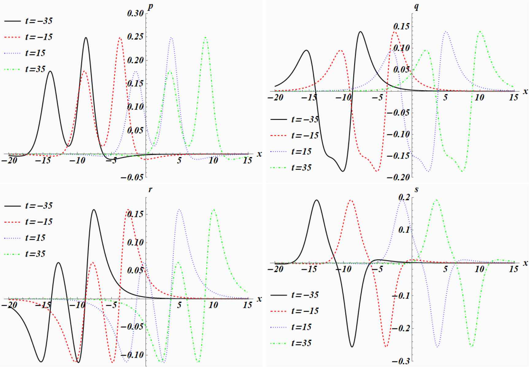 Canonical component functions p, q, r and s (clockwise starting in the top left corner) of the decomposed onesoliton solution uΟ,ΞΈ,Ο,Ο;Ξ± to the bicomplex KdV equation (2.16) with broken π«π―-symmetry at different times for Ξ± = 0.5, Ο = 1.3, ΞΈ = 0.4, Ο = 2.0 and Ο = 1.3.
