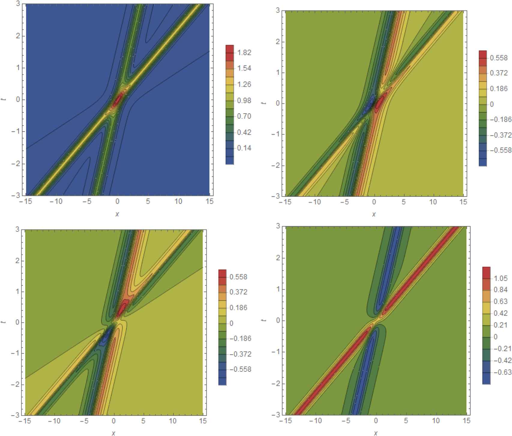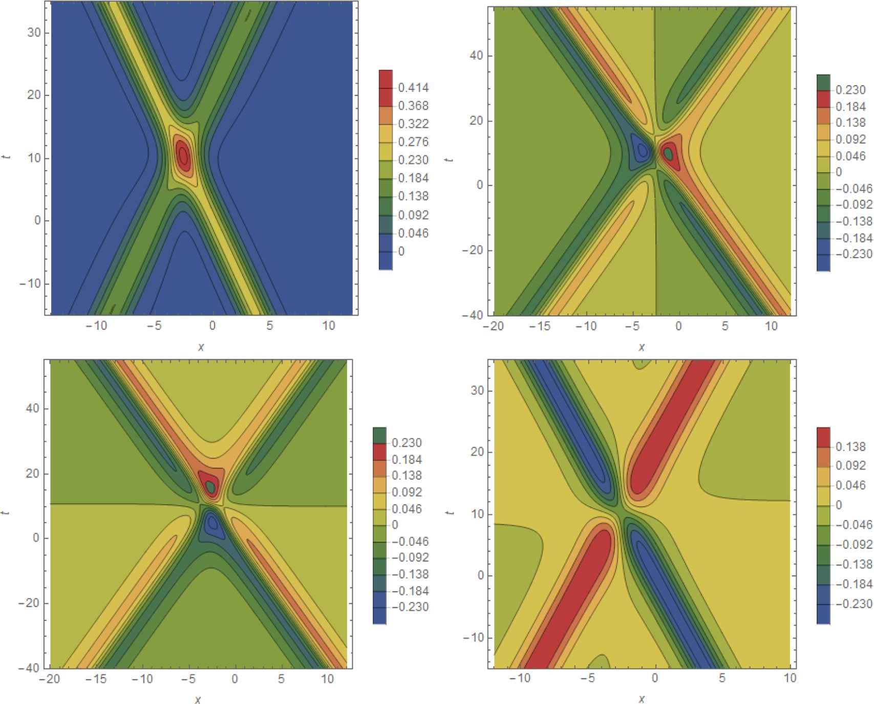 Head-on collision of a bright soliton with a dark soliton in the canonical components p, q, r, s (clockwise starting in the top left corner) for the one-soliton solution hΟ,ΞΈ,Ο,Ο;Ξ± to the bicomplex KdV equation (2.16) with broken π«π―-symmetry for Ξ± = 0.5, Ο = 1.3, ΞΈ = 0.1, Ο = 2.0 and Ο = 1.3. Time is running vertically, space horizontally and contours of the amplitudes are colour-coded indicated as in the legends.