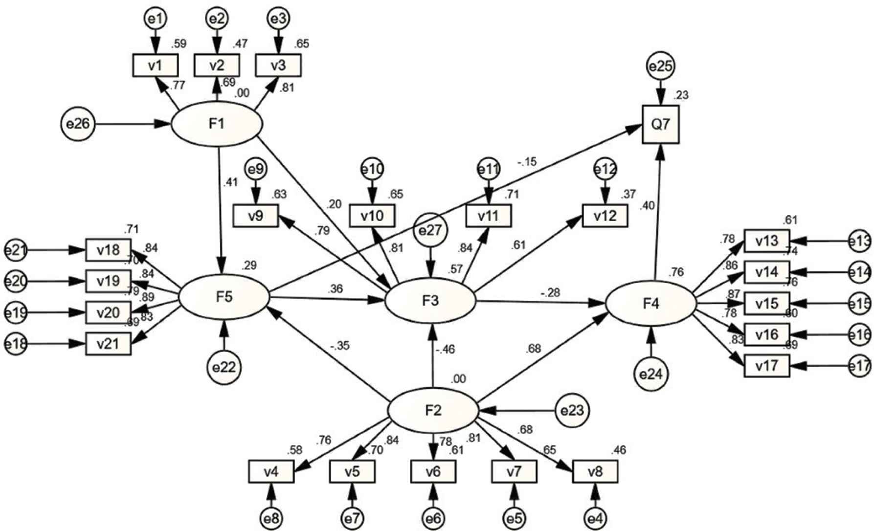 Structural equation Model. Note: F1: perceived severity, F2: perceived benefits, F3: perceived barriers, F4: self-efficacy, F5: perceived susceptibility, Q7: behavior stage; The path coefficient in the figure is the standardized coefficient, and the path coefficient in the figure is statistically different (p ≤ 0.05). v1–v21: Entry.