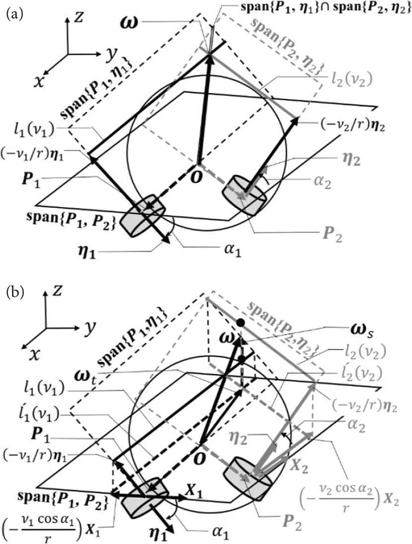 Further, from the property of the constraint roller (i.e., that slip does not occur in side direction of the roller), ω must be on span{ηi, Pi}. Thus, Eq. (3) indicates that ω is constructed as the sum of (νi/r)ηi and Pi (see Figure 1). Thus, ω cannot be uniquely determined using a single roller. However, the end point set of ω can be represented as a line set as follows: