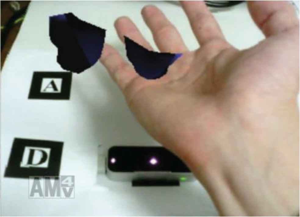Figure 4 is a deformation manipulation of the virtual object. We confirmed that the virtual object can be deformed by crushing the virtual object with the user’s thumb and index finger.