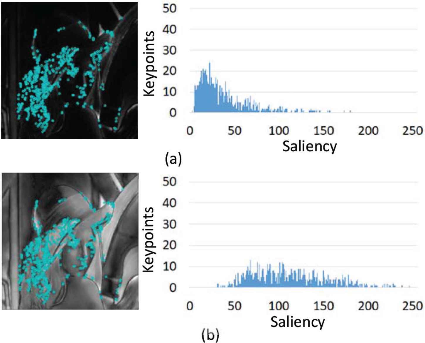 Figures 11 (for Lenna) and 12 (for Flower) show the location of keypoints on saliency map (Left), the histogram which indicates the response of saliency at the locations respectively. There is difference in frequency component, however, for the case of the proposal, the location of the peak in the histogram is higher saliency than other saliency map. Thus the inner product in Equation (13) becomes larger. The change of WObj,i means the image reduction, then high frequency component increases. The proposal recorded smaller