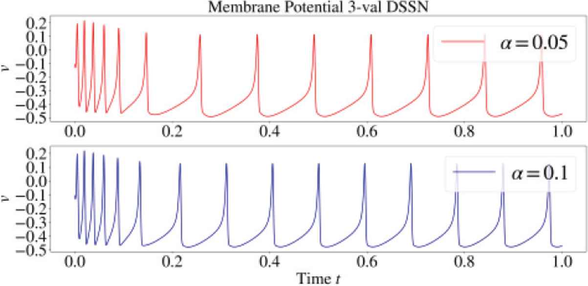 Two variables in the DSSN model, membrane potential v and a variable n that represents a group of ion channels, are responsible for generating neuronal spikes.