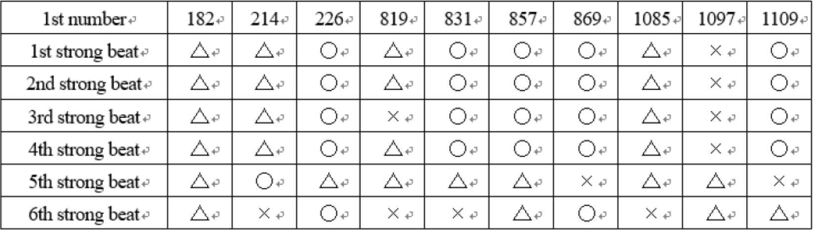 Using graphs and correlations, we compared inferred phrases with actual performance. The Search system found 18 similar phrases. Table 3 shows the 10 data selected by Dynamics symbols. ○ indicates that the numerical value is 80% or more of the maximum value, and × indicates that the value is 40% or less, and △ indicates neither of them. From Table 3, the optimal phrase was selected as the 1st number 226. For confirmation, Table 4 shows the correlation coefficient between each similar phrase and actual performance.